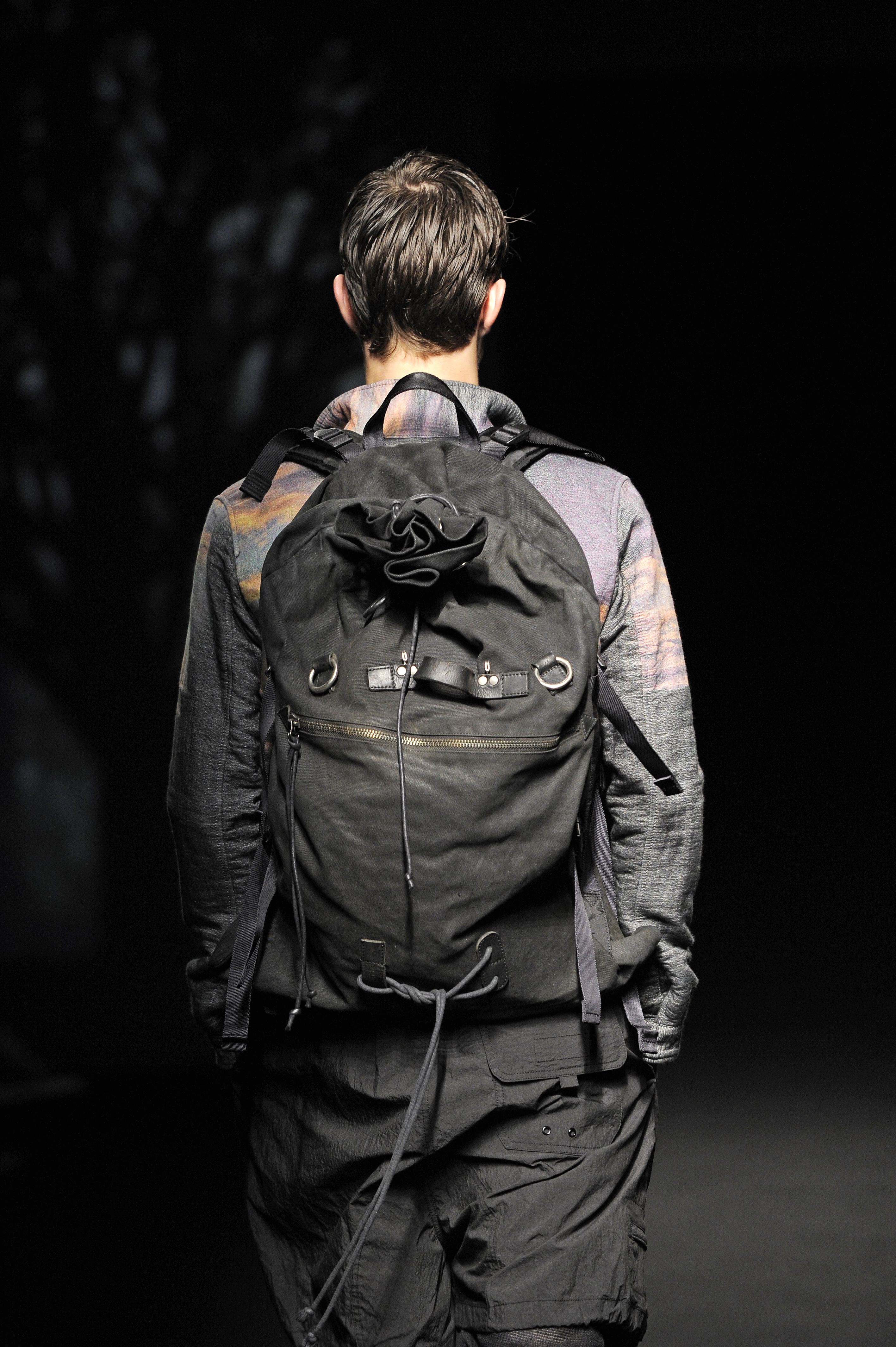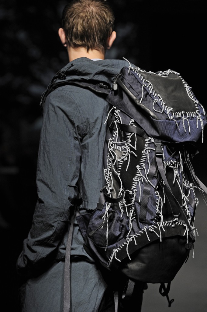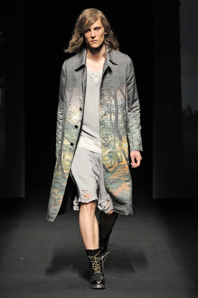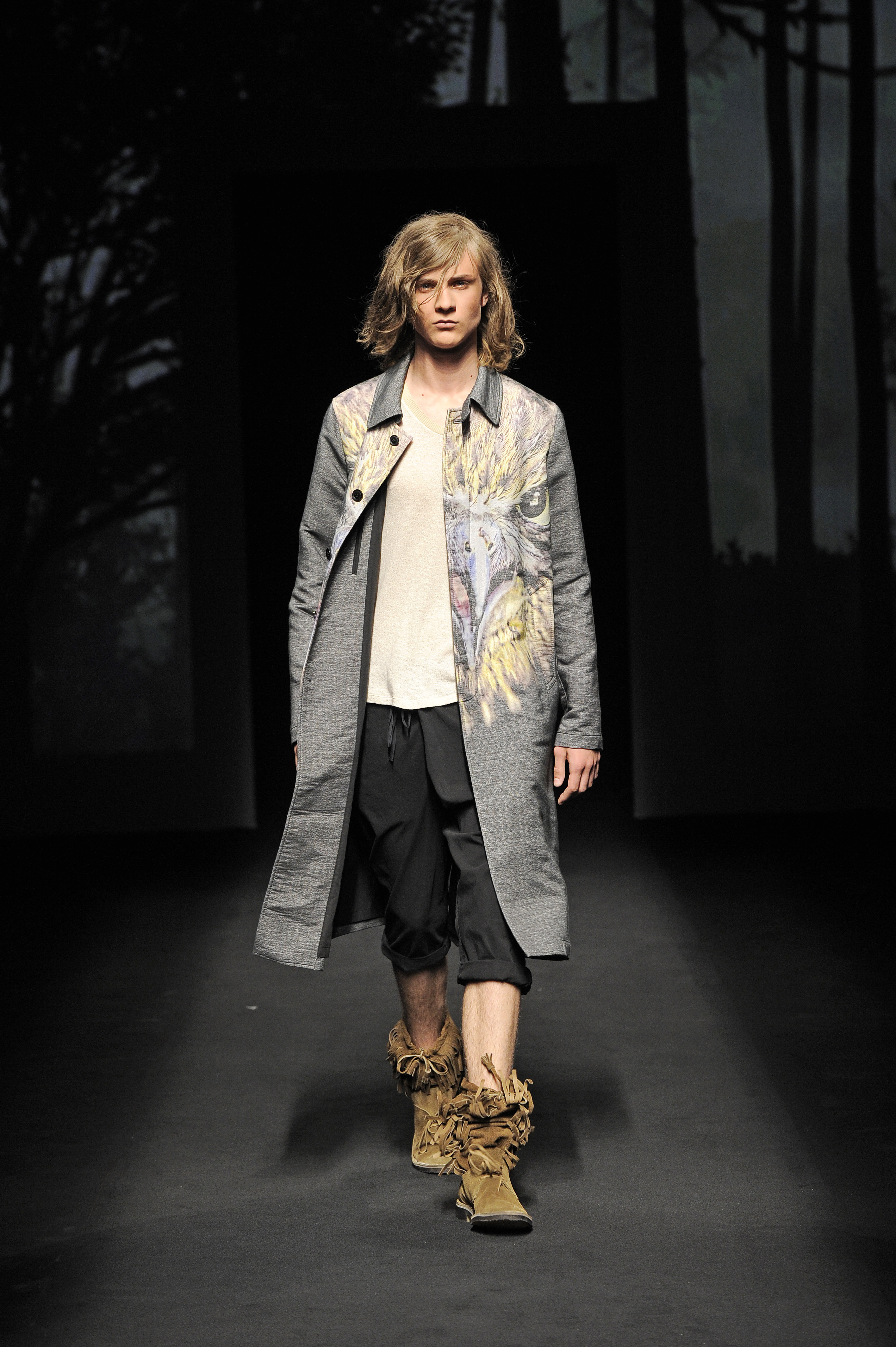 Inspiré par le livre de Henry David Thoreau Walden ou la vie dans les bois et par le film de Sean Penn Into the Wild, le créateur nous a proposé un show onirique combinant effets visuels et collection aboutie sur la relation entre l’homme et son environnement et plus précisément entre l’homme et la nature. Et lorsque l’homme se retrouve de nouveau envoûté par les lumières de la ville, il n’en oublie néanmoins pas ses nouvelles dispositions. Et pour accompagner le mâle urbain dans son périple vers son élément naturel, la société japonaise WOW a créé une mise en scène de toute beauté projetant des ombres chinoises en relation avec les silhouettes défilant sur la scène sur un mur écran de vidéo-projection.