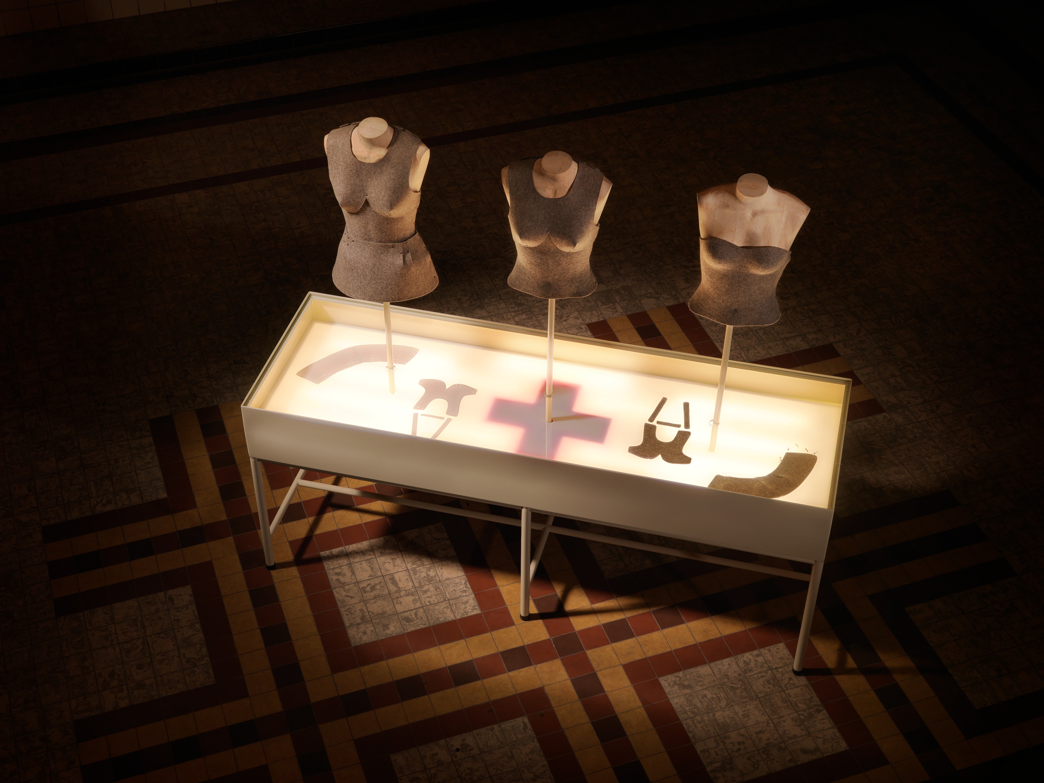 An Vandevorst et Filip Atricks imaginent trois bustes en bois habillés de bustiers en feutre. Leurs particularités : il s’agit de pièces modulaires. On retire et ajoute des morceaux comme dans un puzzle en trois dimensions. Le plus étonnant, est l’absence de coutures, chaque élément tient juste par des goupilles en cuivre. Pas d’objet cliché et sexy mais une création reflétant un aspect artisanal.