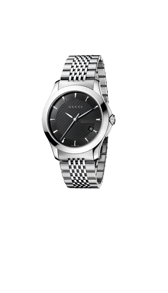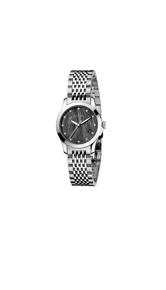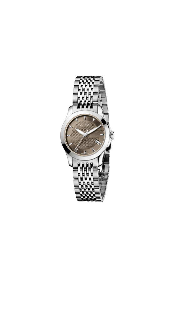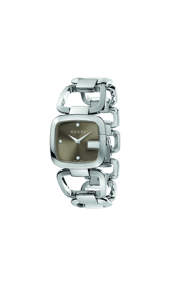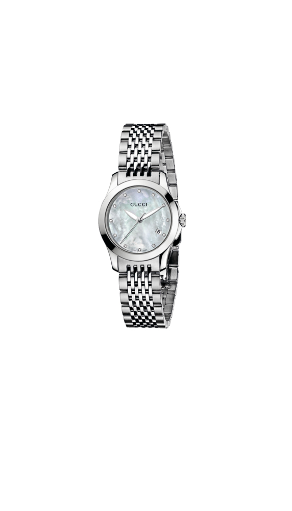 Cette collection offre différents styles et variantes sur des modèles féminins de petite taille ou des modèles unisexes de taille moyenne. Un modèle plus imposant doté d’un mouvement chronographe robuste et sportif rappelle avec subtilité les racines du style Gucci, avec sa passion pour la navigation et les sports nautiques. Une autre version du modèle 27 mm, à la fois ultra-tendance et facile à porter, révèle une éblouissante lunette sertie de diamants, qui épouse un cadran en nacre également serti de 12 diamants étincelants. Les montres G-Timeless sont proposées sur d’élégants bracelets en acier, cuir, caoutchouc ou PVD. La face interne des bracelets en cuir et caoutchouc est estampillée de la signature GG. La collection offre également un très vaste choix de finitions de cadran telles que le noir jais, l’argenté brossé, le blanc pur ou le classique brun Gucci.