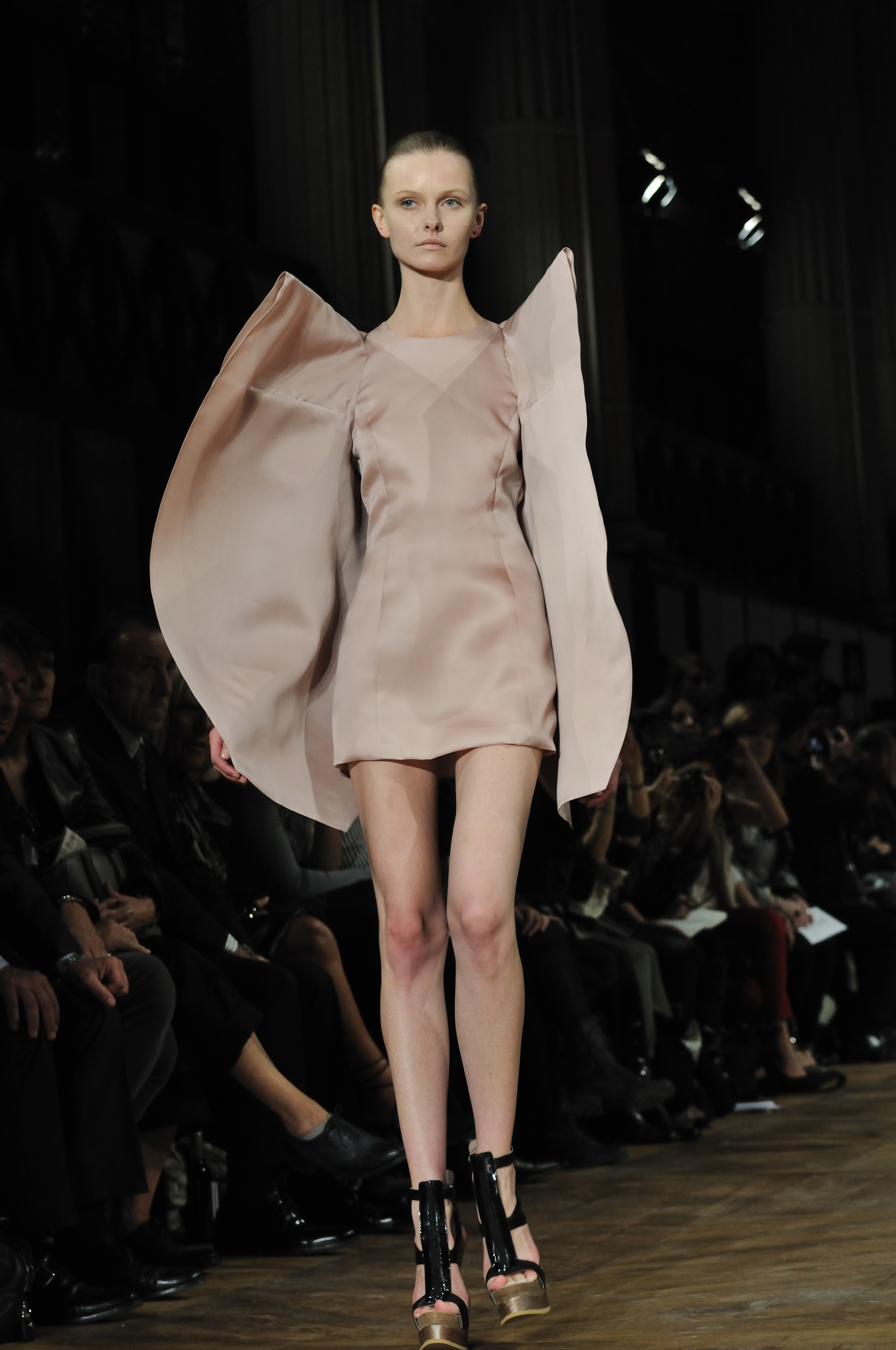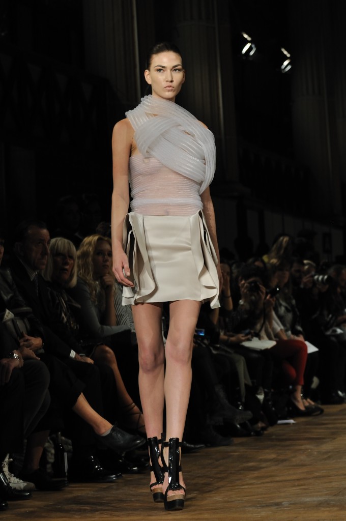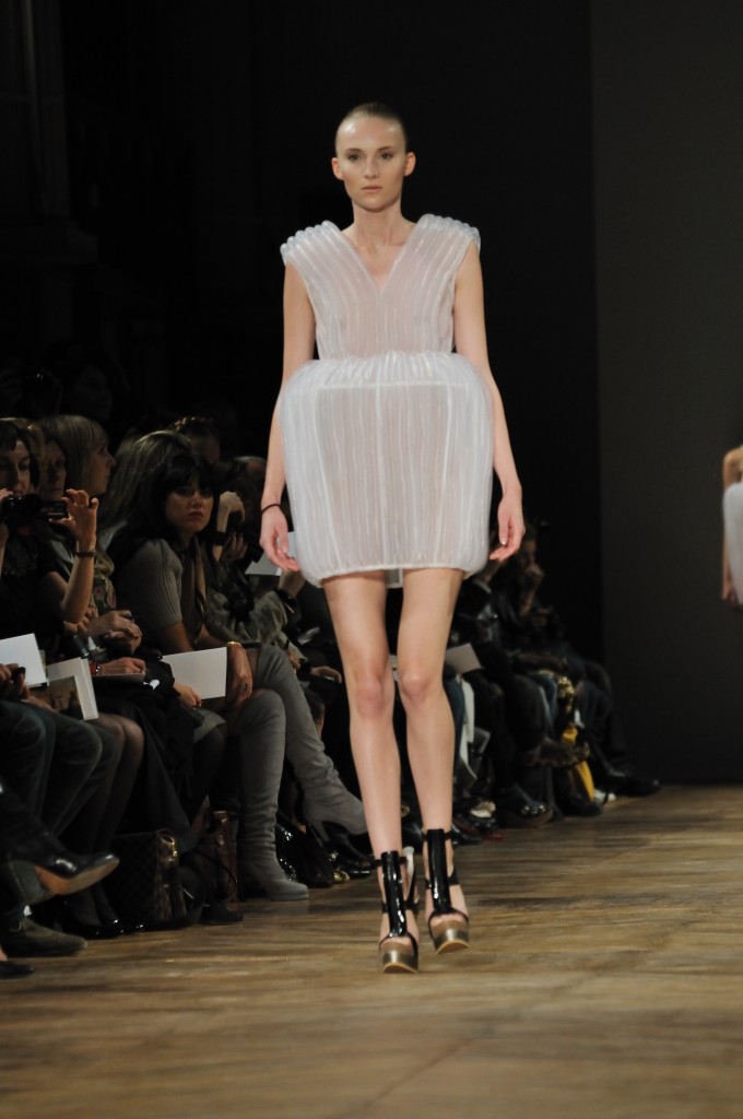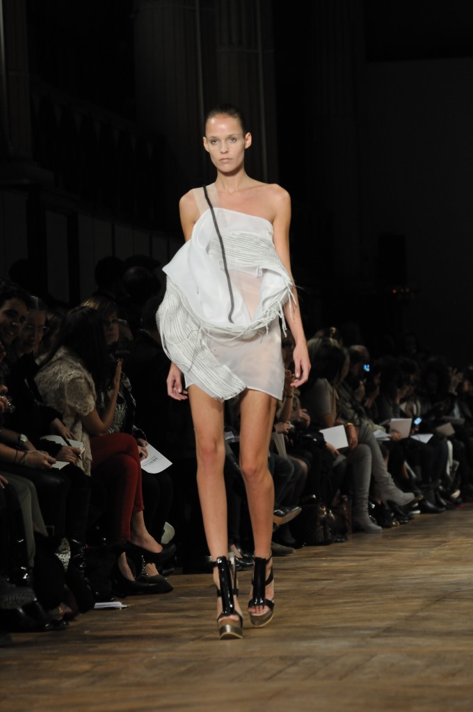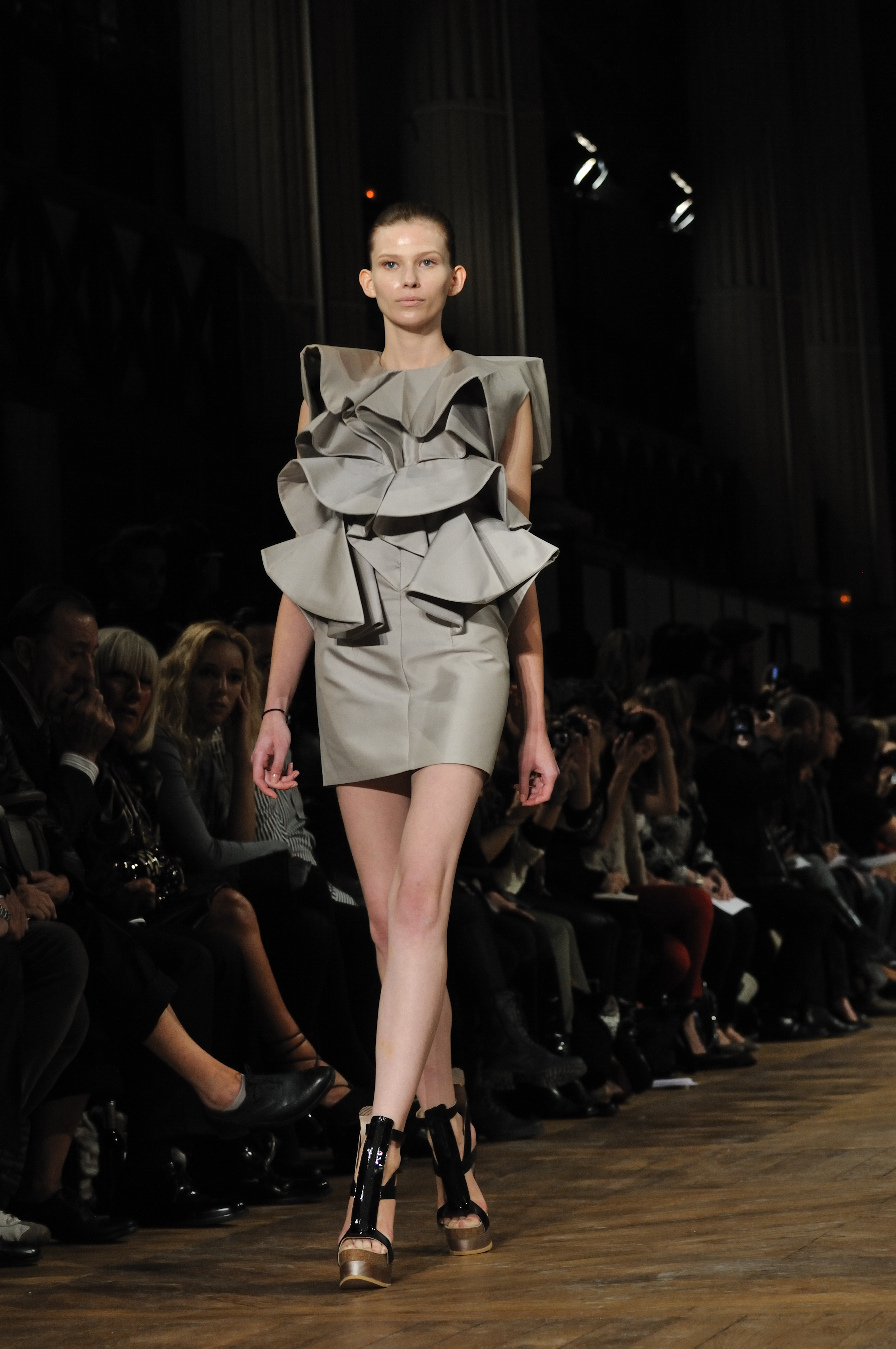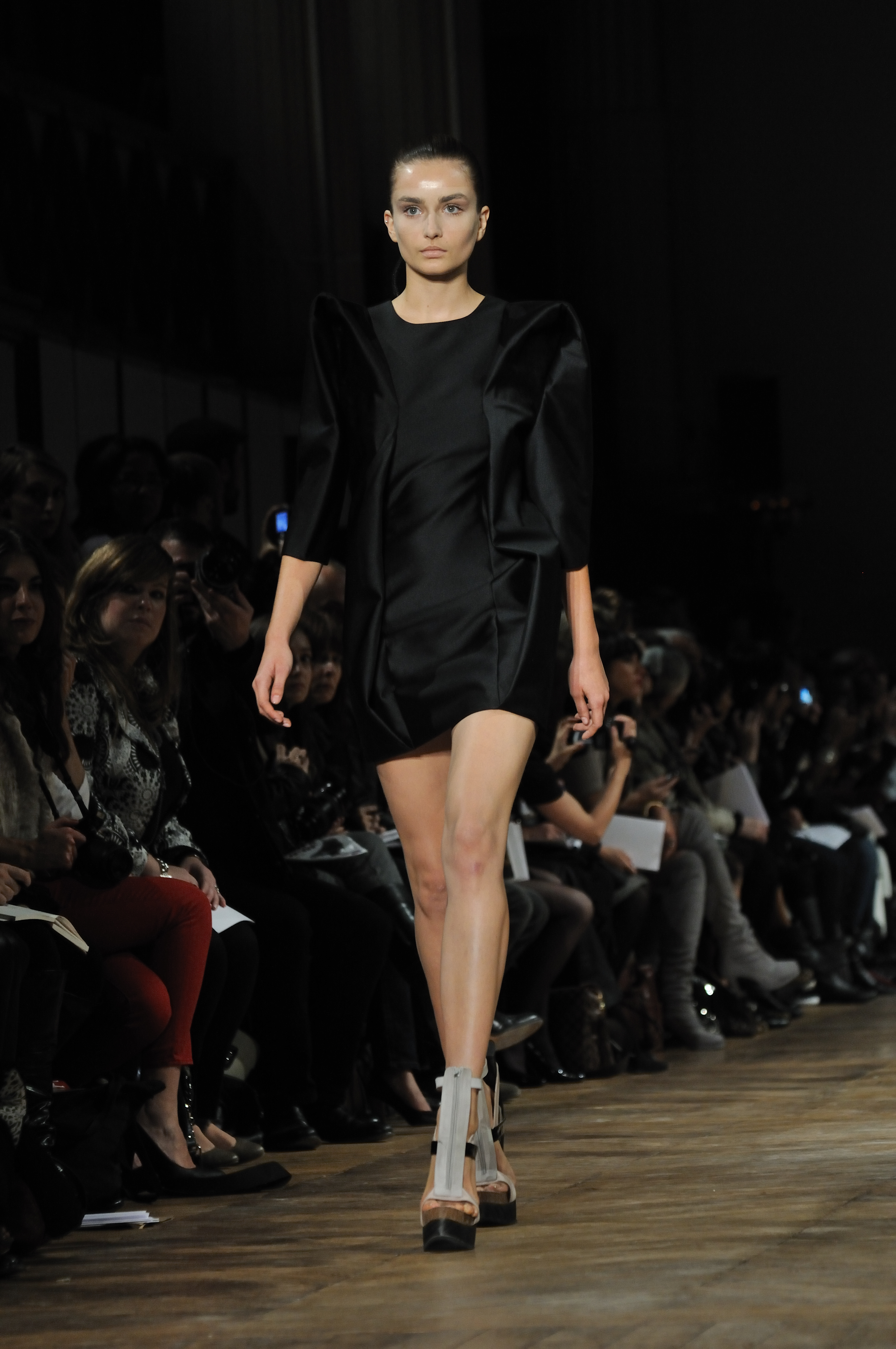 La créatrice espagnole Amaya Arzuaga, pour sa première participation aux défilés parisiens, nous propose pour le Printemps-Été 2011 des silhouettes très graphiques inspirées des œuvres du peintre allemand Oskar Schlemmer. Semblant presqu’avoir été sculptée selon l’art délicat de l’origami, chaque pièce n’en reste pas moins excessivement féminine et terriblement aérienne. Rigueur géométrique, volume et structures linéaires créent des silhouettes innovantes aux contours doux marquant la taille et mêlant robes courtes, jupes et combinaisons aux épaules asymétriques.