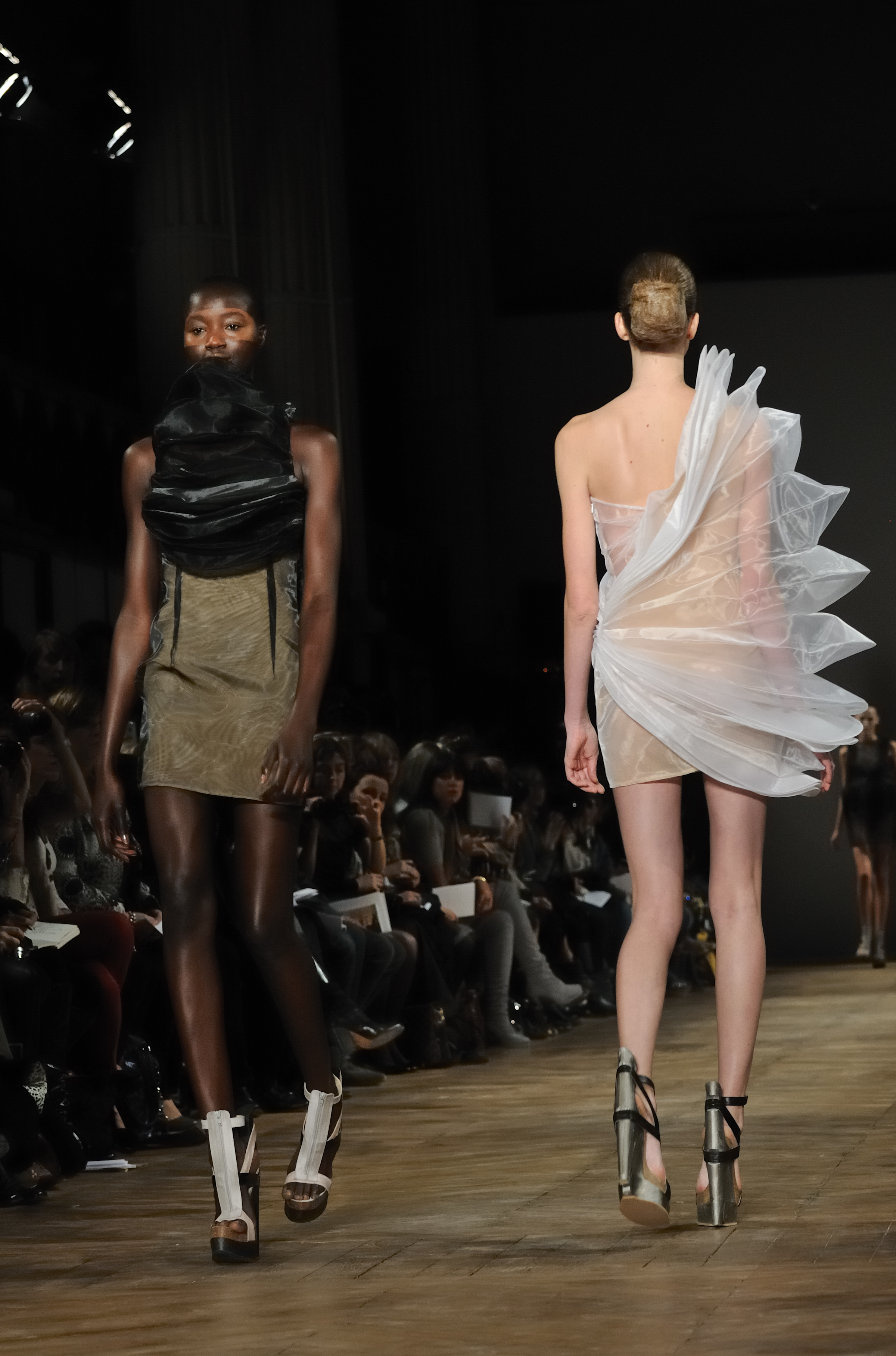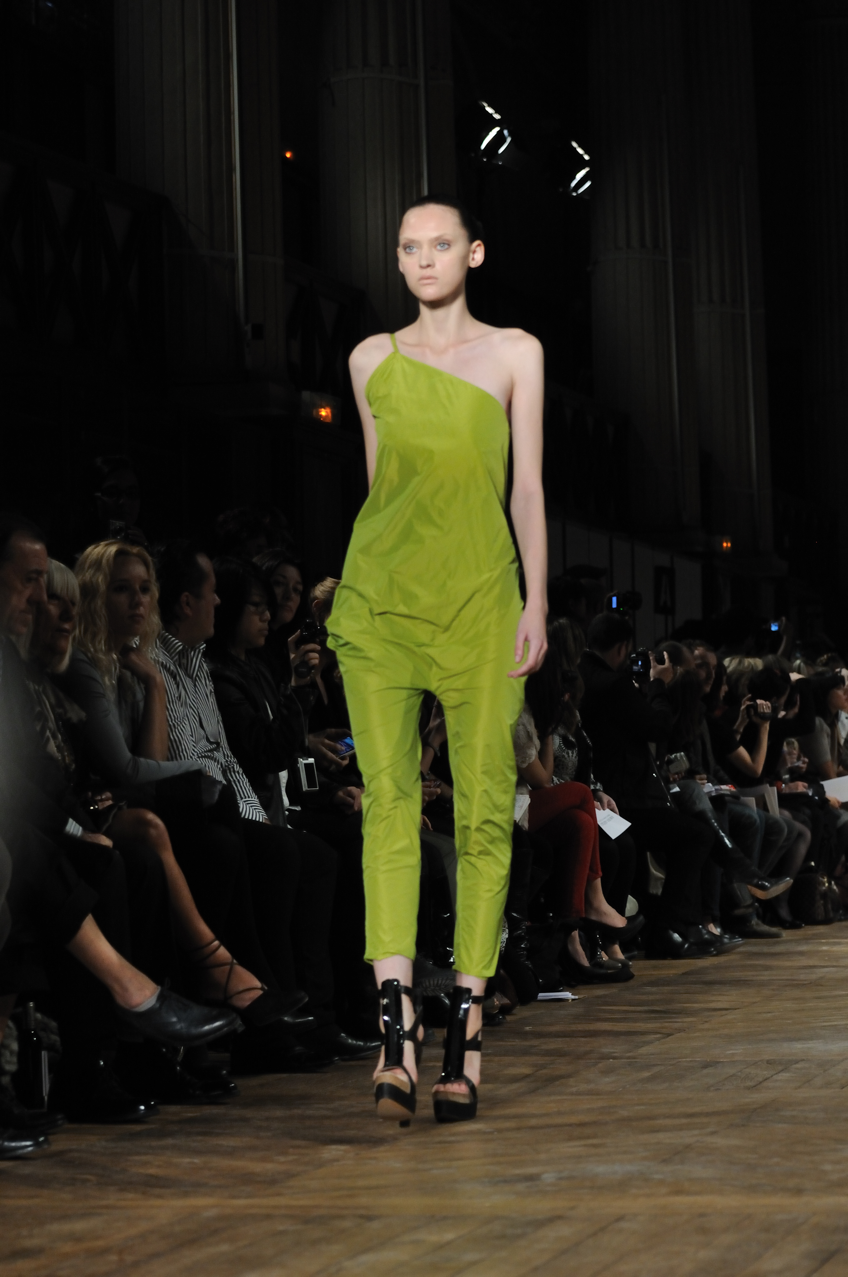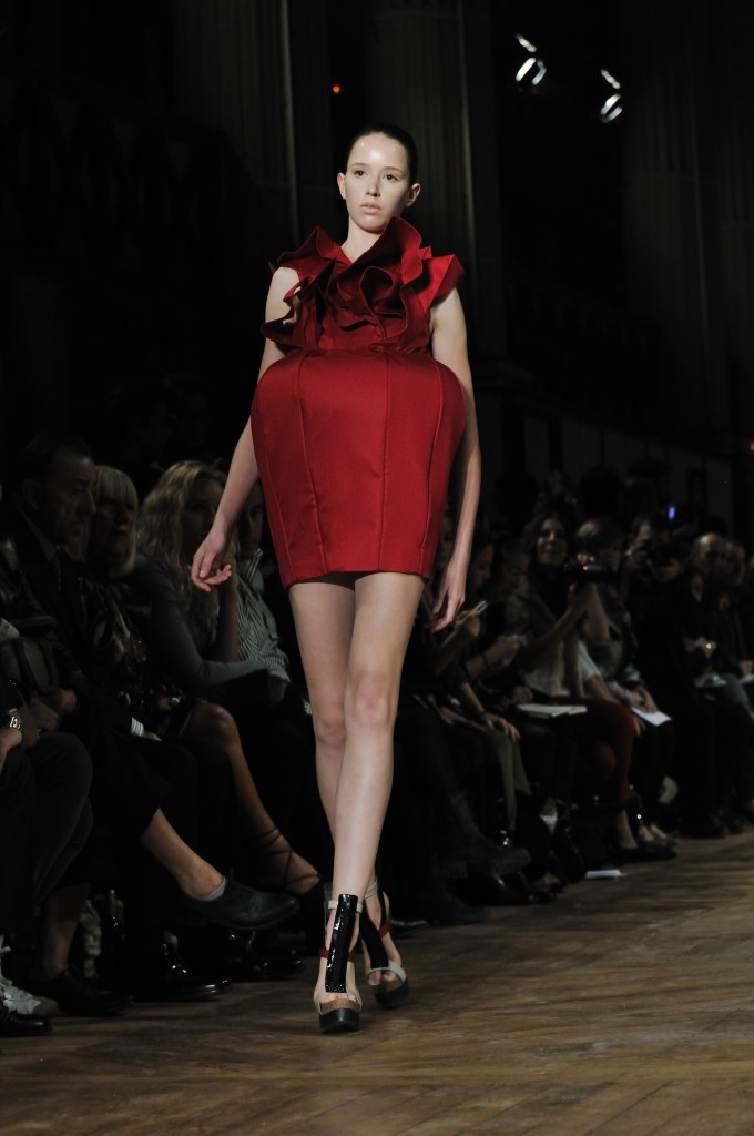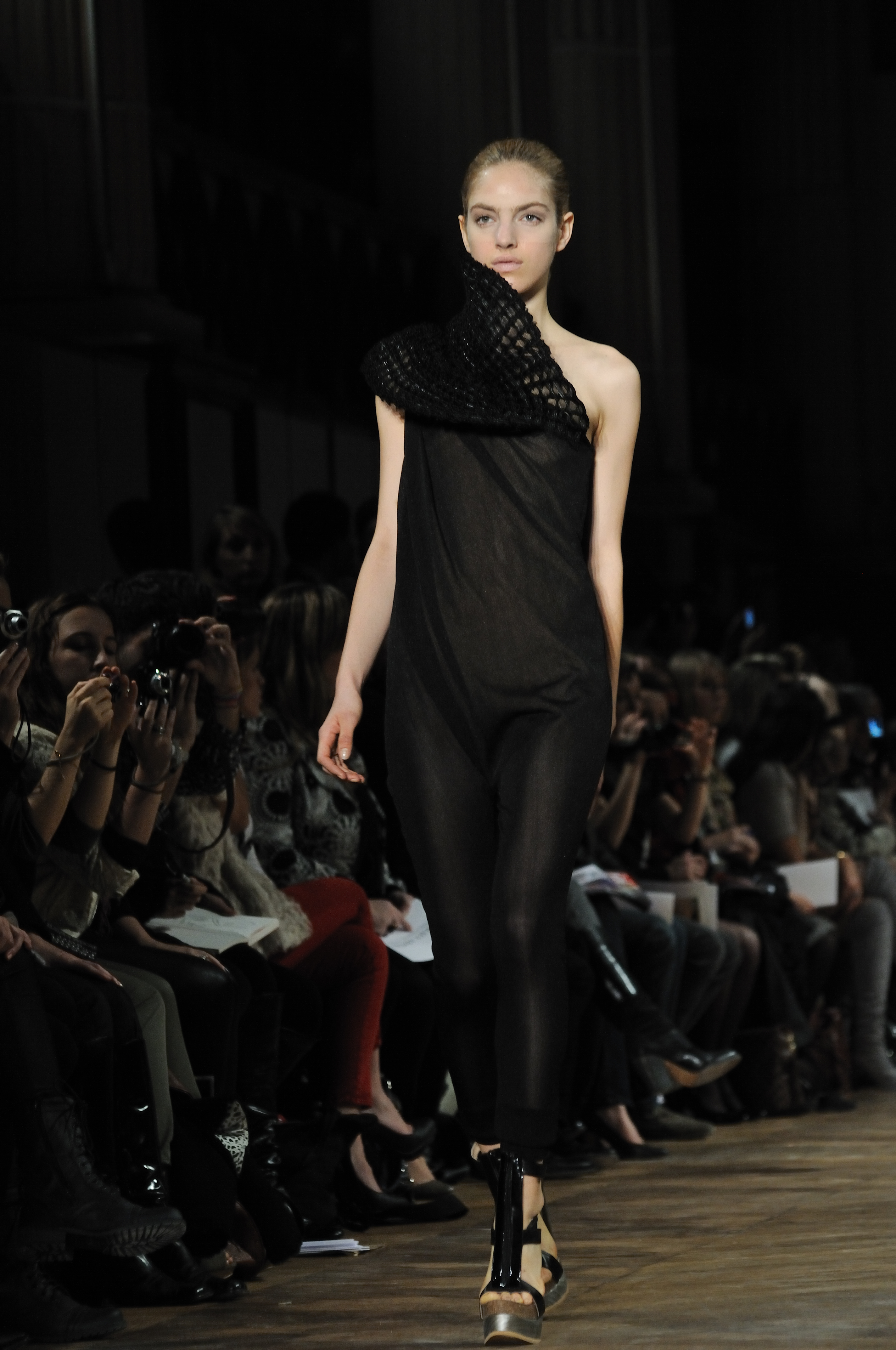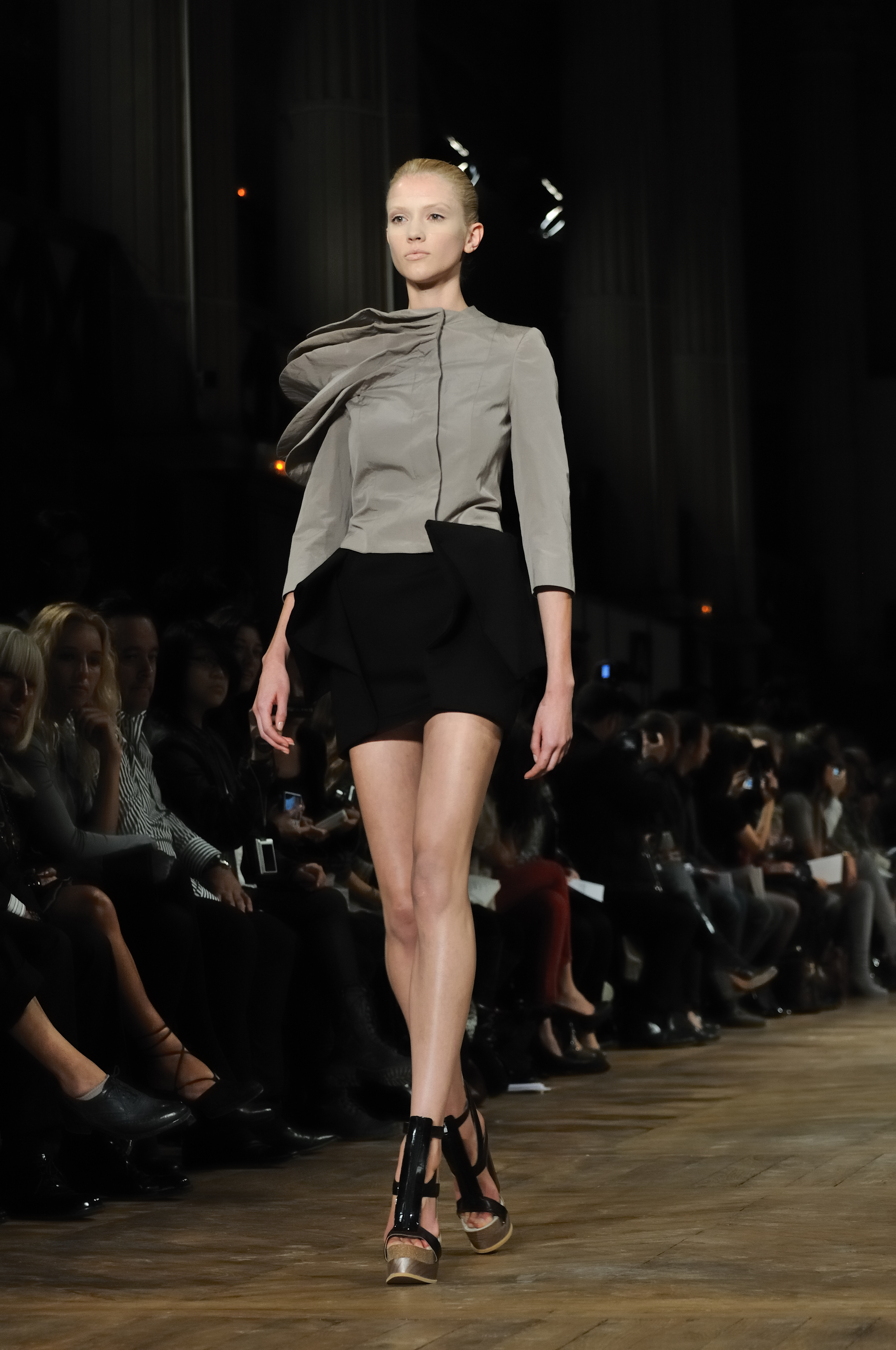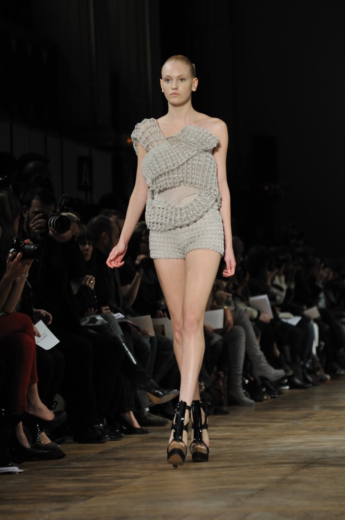 La créatrice espagnole Amaya Arzuaga, pour sa première participation aux défilés parisiens, nous propose pour le Printemps-Été 2011 des silhouettes très graphiques inspirées des œuvres du peintre allemand Oskar Schlemmer. Semblant presqu’avoir été sculptée selon l’art délicat de l’origami, chaque pièce n’en reste pas moins excessivement féminine et terriblement aérienne. Rigueur géométrique, volume et structures linéaires créent des silhouettes innovantes aux contours doux marquant la taille et mêlant robes courtes, jupes et combinaisons aux épaules asymétriques.