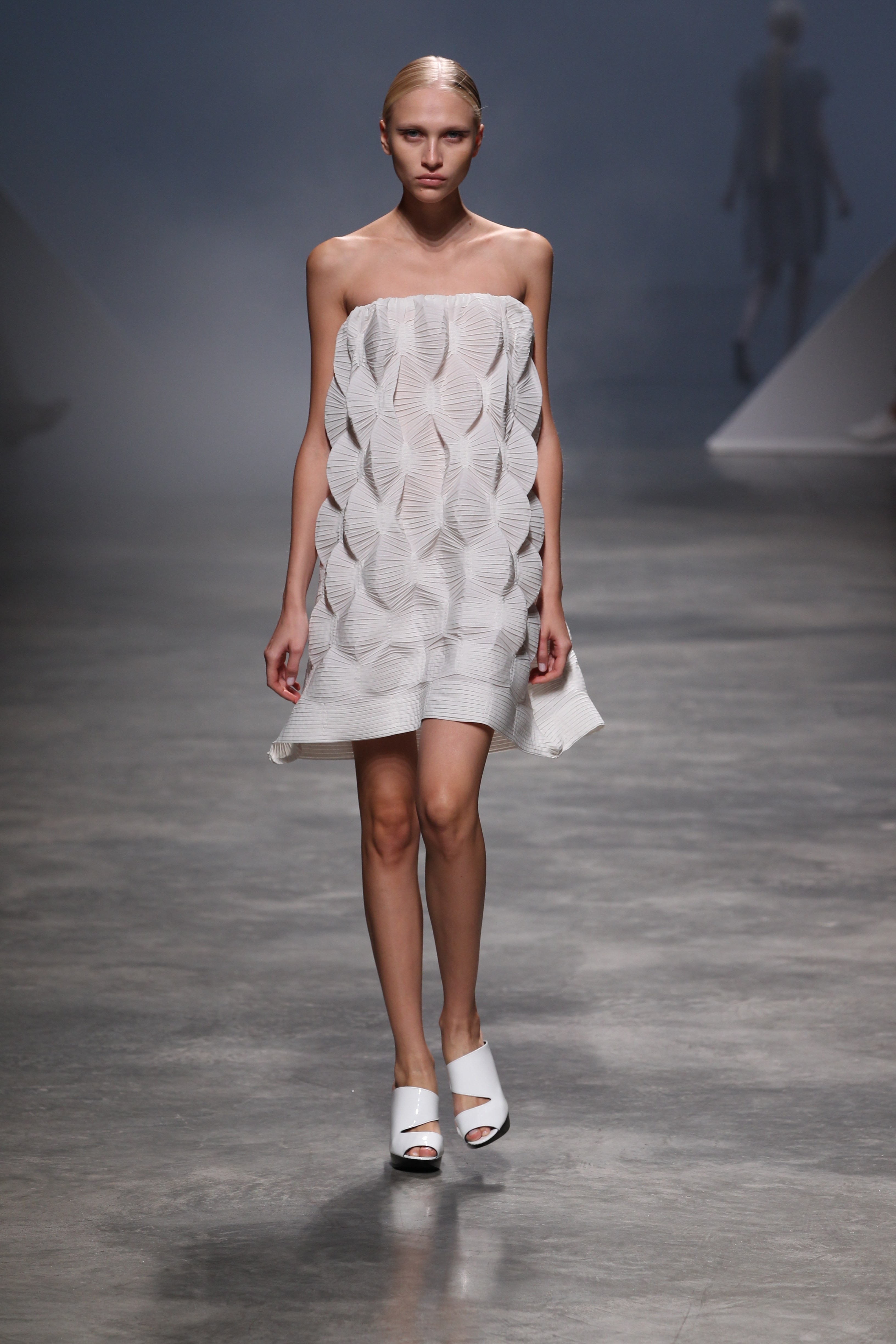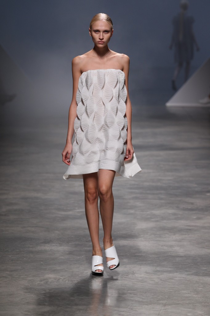 Une première robe plissée grise nous invite à ouvrir les yeux et à voir celui du fantôme qui nous regarde cherchant un nouveau vêtement à envoûter. Tissus aériens, ensembles blancs ornés de disques argentés, travail d’orfèvre proche de l’origami sur vestiaire blanc immaculé nous font d’emblée rentrer dans l’imaginaire de Dai Fujiwara, le directeur créatif d’Issey Miyake.