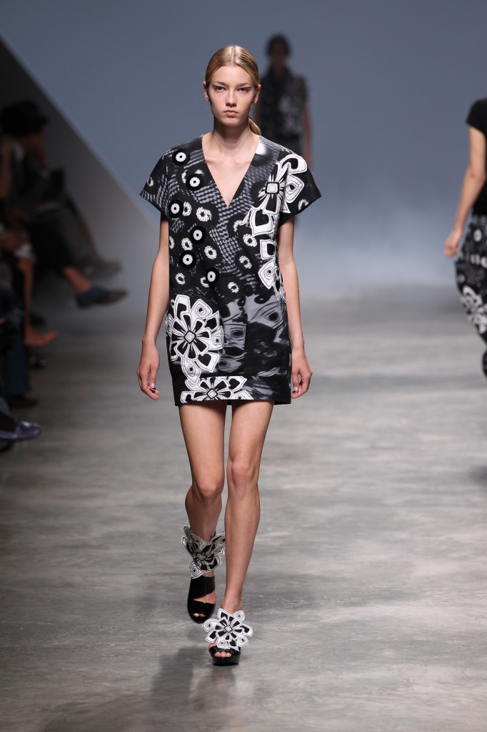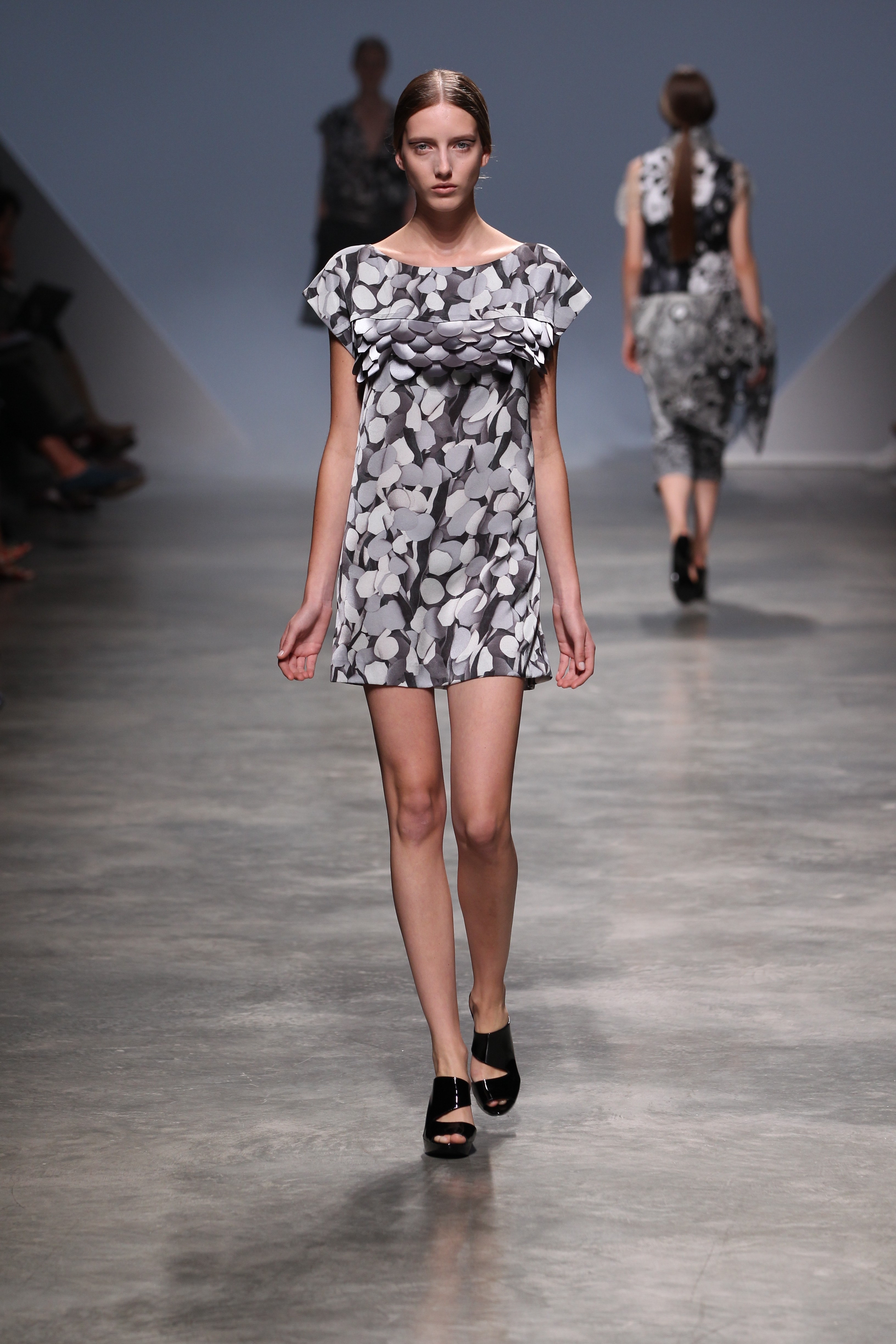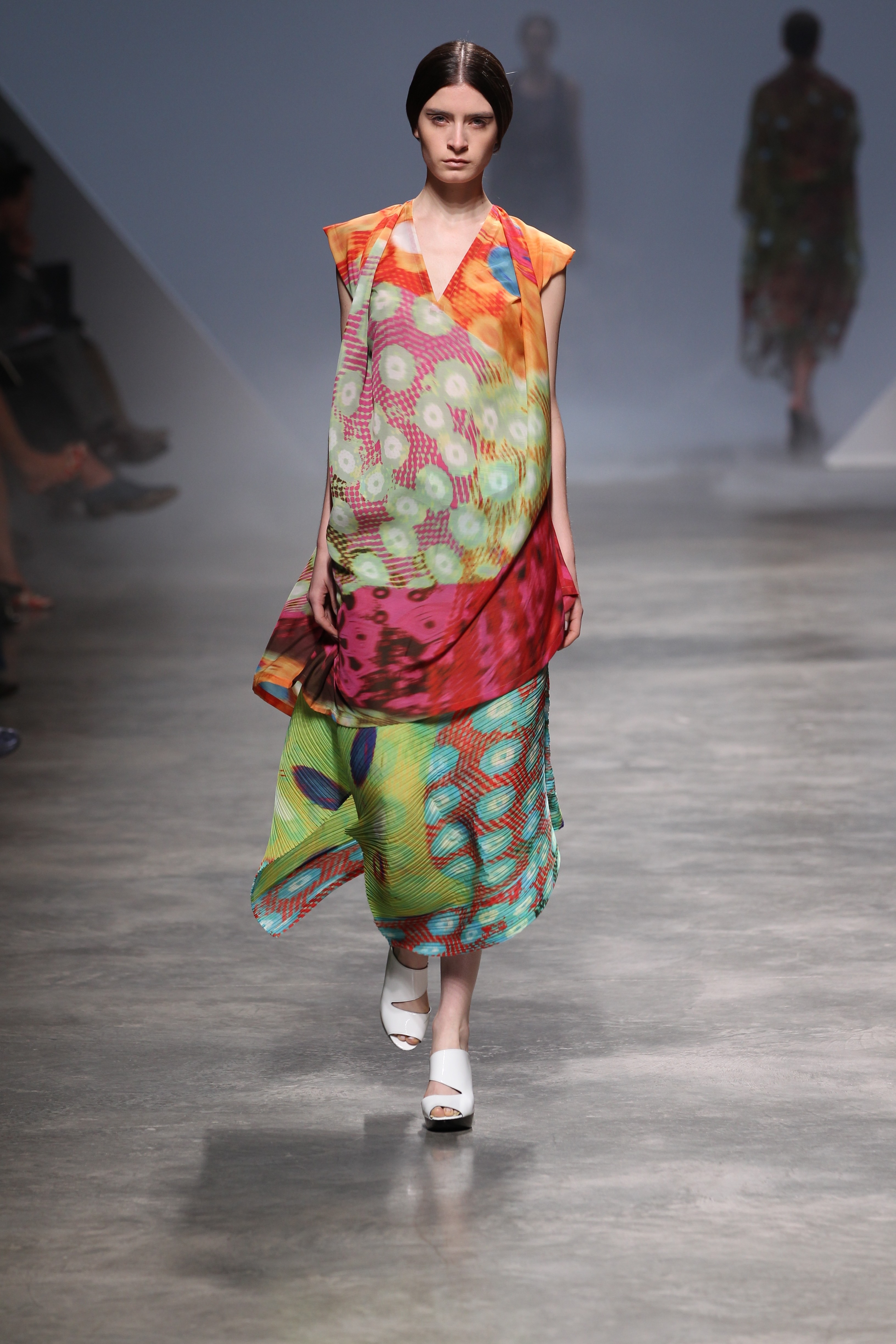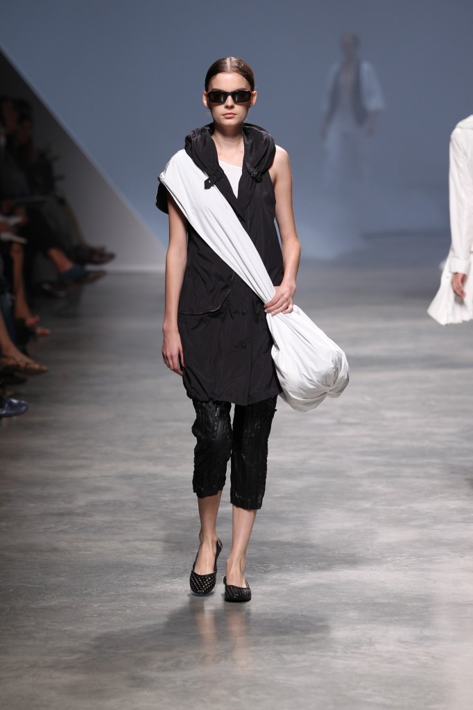 Silhouettes hypnotiques empreintes de détails japonisants, les vestes se font vestes de kimonos de face comme de dos, les jupes sont bouffantes et les pantalons sarouels de luxe. Des tenues sportives côtoient des silhouettes plus recherchées avec une constante : cette impression perpétuelle que l’air traverse littéralement chaque vêtement.