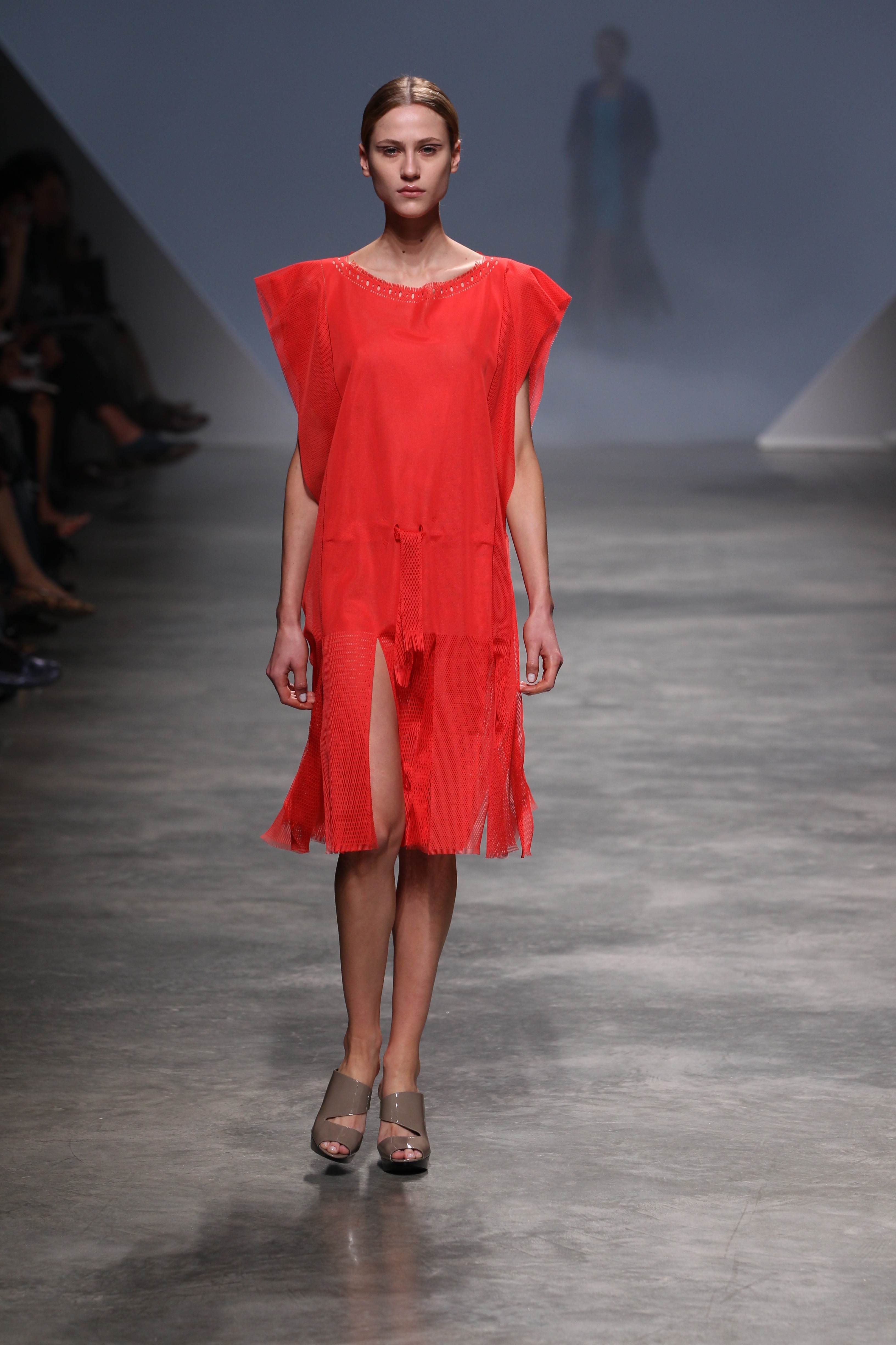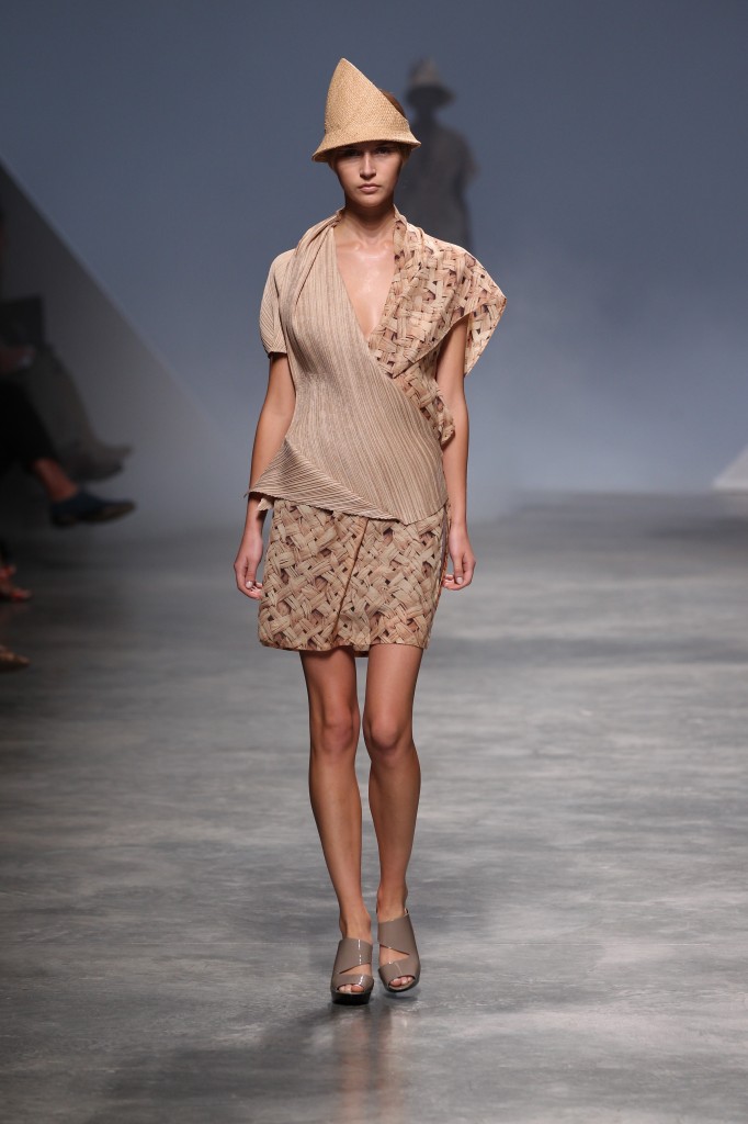Très vite, les silhouettes blanches s’agrémentent de vestes ou de gilets en cuir noir froissé. Puis la couleur apparaît pour un temps enfin éclatante en rouge, jaune et turquoise avec des silhouettes portant des tissus ultrafins que Dai Fujiwara aime superposés. Les silhouettes bicolores reviennent pour mieux laisser la place à une série de robes et tuniques d’un beige couleur paille mettant en valeur un rafia à motifs déformés rappelant le bois, formidable effet de texture.
