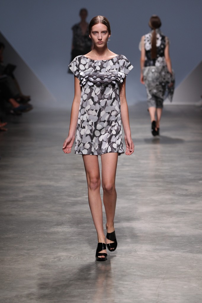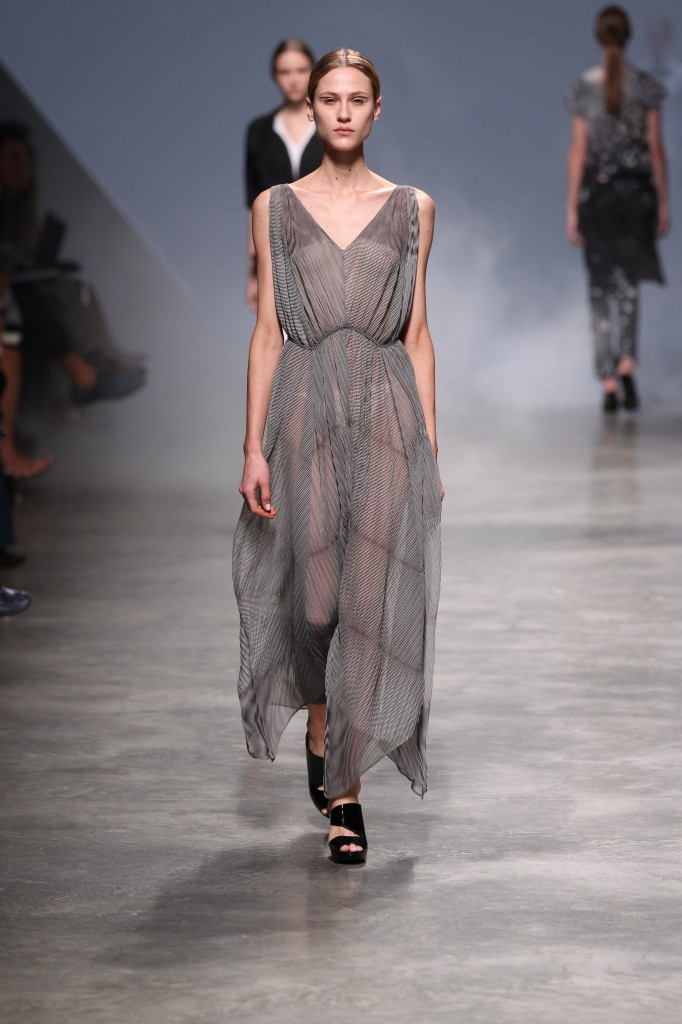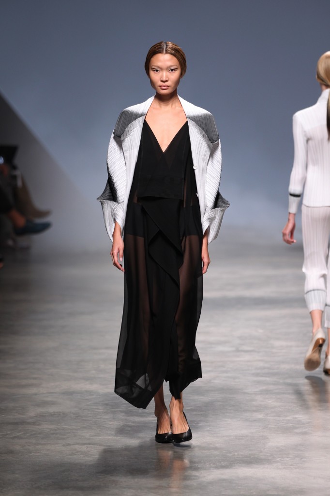 Et que serait un défilé Issey Miyaké sans ses fameux plissés dont Dai Fujiwara garde jalousement le secret de fabrication ? Certains modèles au plissé horizontal semblent mus par un mouvement qui leur est propre au gré des pas des mannequins.
