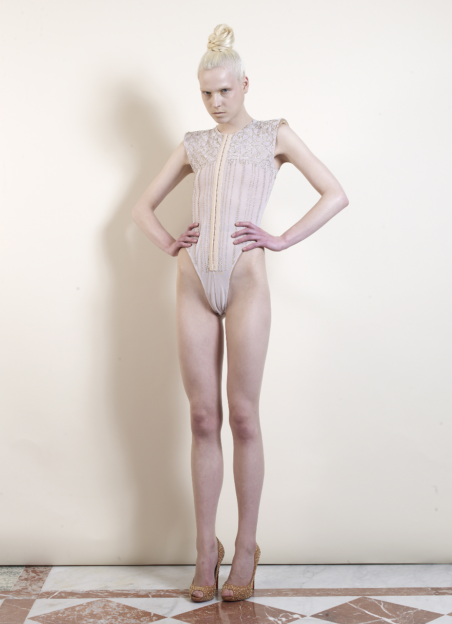 Aspects lisses et brillants, entremêlements de broderies métalliques sur matières douces et fluides, alignements de surpiqûres donnant un aspect « matelassé »… Le duo suisse s’amuse à intégrer subtilement des jeux de textures.