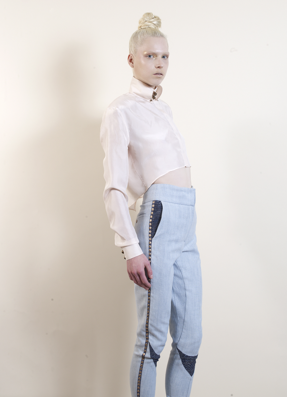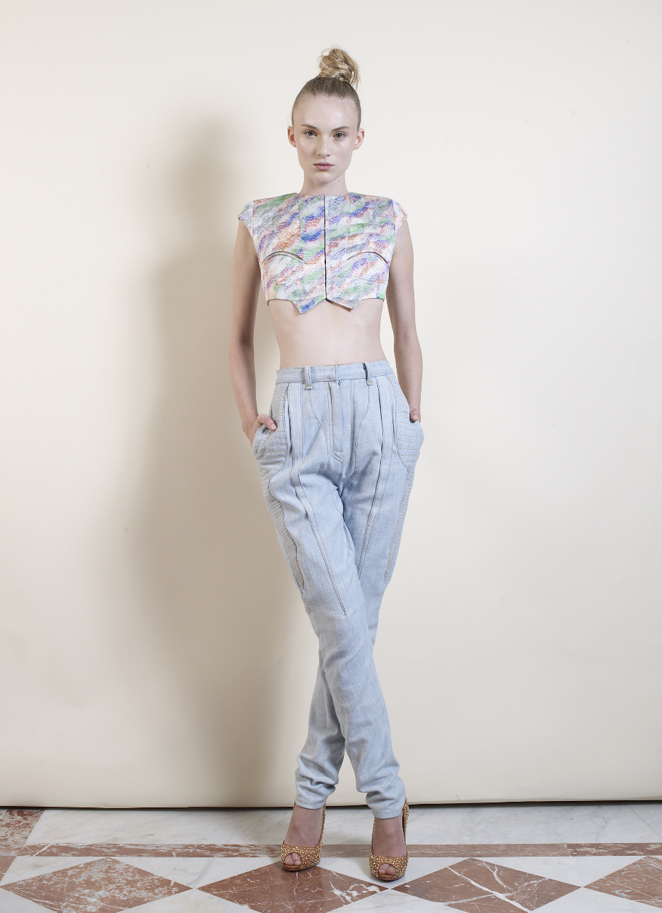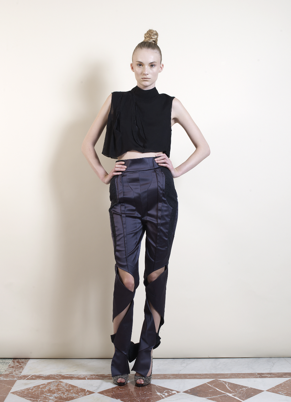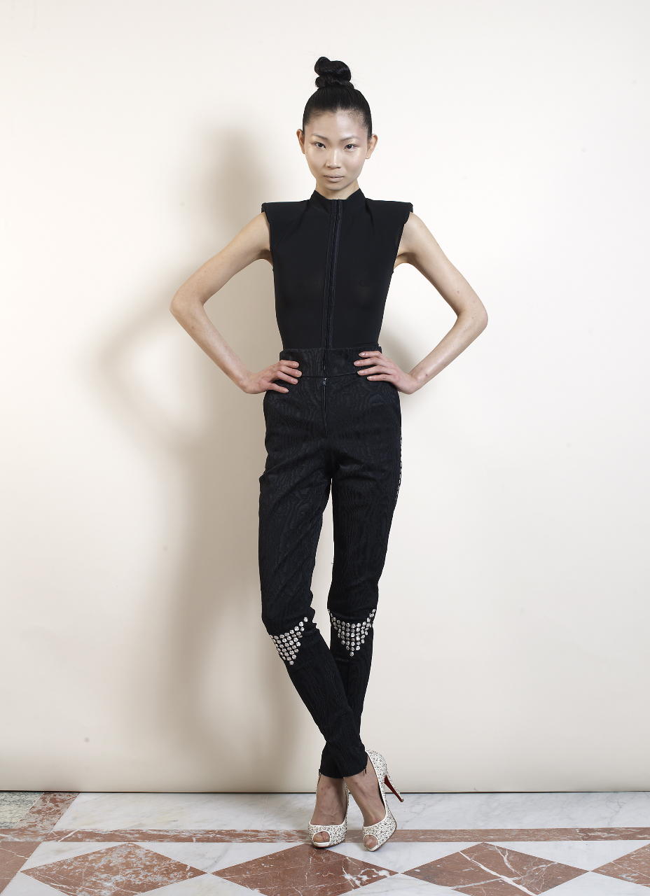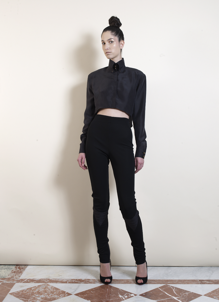 Les épaules sont marquées, à la fois par la coupe et les changements de matières et de couleurs. Les pantalons fuselés sont échancrés en-dessous des genoux.