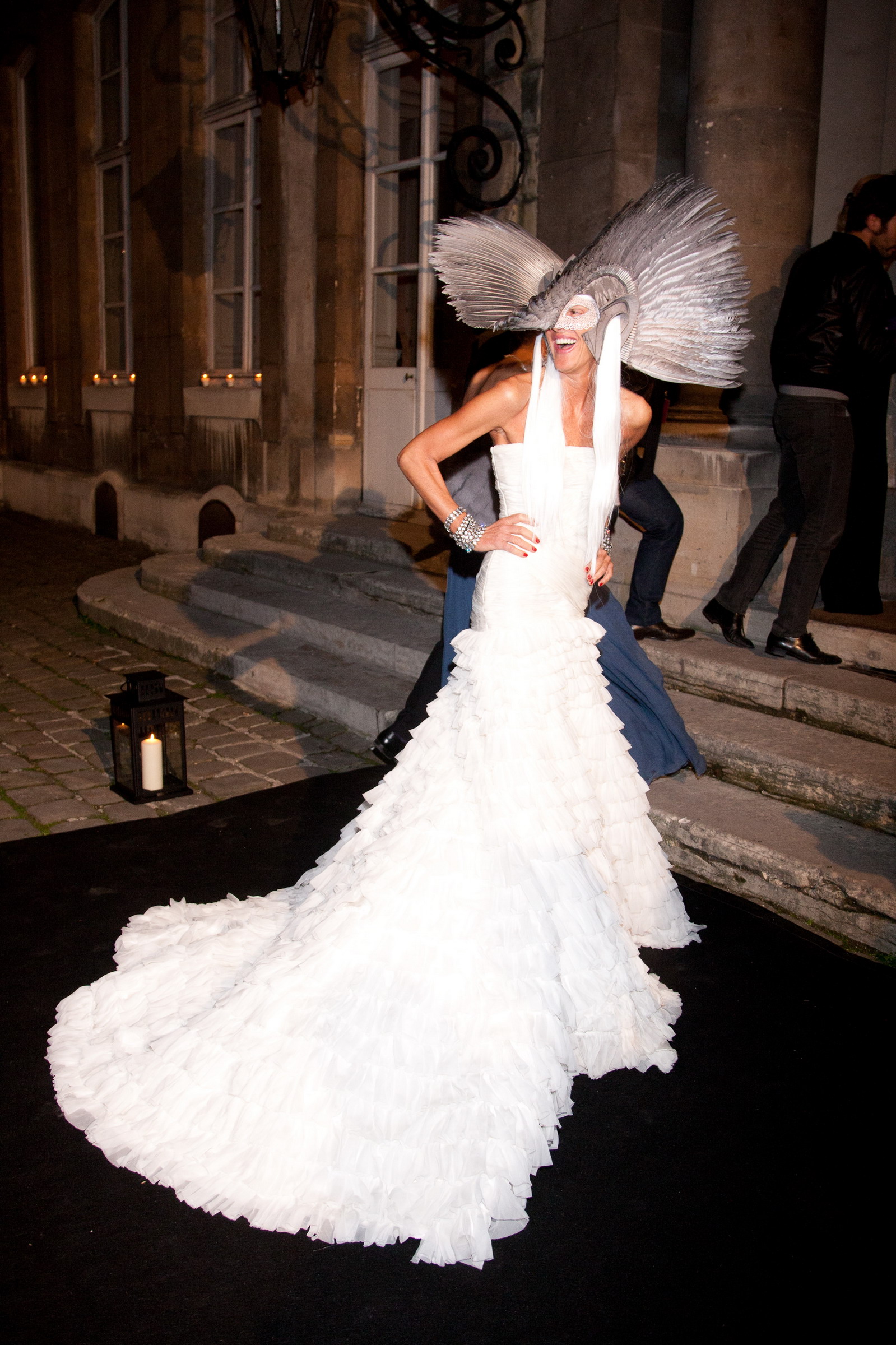 Ainsi Anna Dello Russo, la rédactrice en chef du Vogue Japonais, a surpassé de loin la plupart des invités en choisissant une longue robe bustier blanche à traine, véritable cascade de tulle blanc créée par Peter Dundas le directeur artistique d’Emilio Pucci. Et elle a fait confiance à Gareth Pugh pour lui créer un époustouflant masque combinant dentelle et plumes grises.