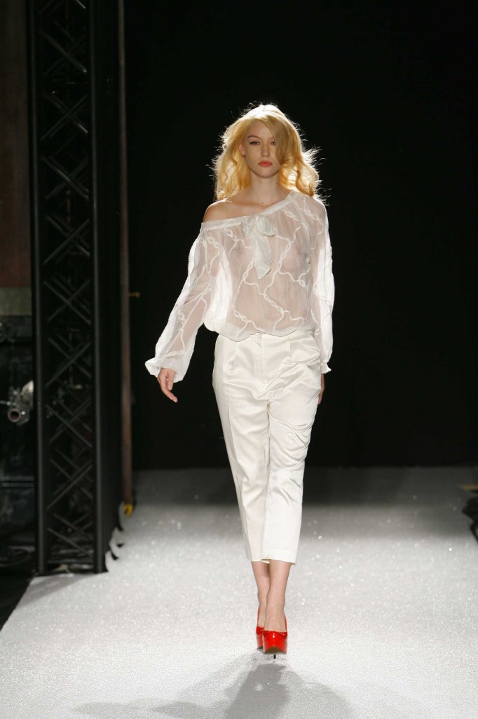 Le noir et blanc est la combinaison gagnante de cette collection Printemps Eté 2011 de Jasmin Santanen. Des Blouses blanches décolletées sur les épaules se portent sur des pantacourts, dévoilant une femme séductrice n’ayant pas froid aux yeux. Les robes en coton en voile, blanches ou noires, froncées, se multiplient dans une allure sophistiquée très années 50 à peine réchauffées d’un manteau d’été aux teintes neutres.