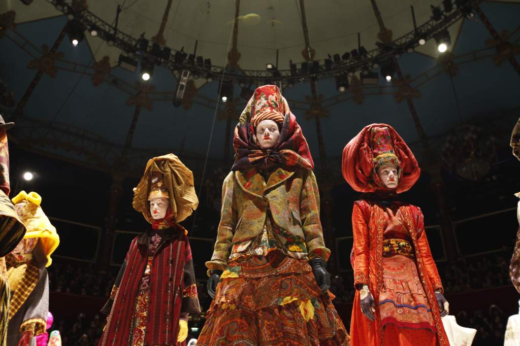 Arrivés une par une sur la scène du Cirque d’hiver, les dernières silhouettes aux maquillages de geisha s’arrêtent au centre d’une scène qui se met à tourner, permettant à tout un chacun d’admirer ces magnifiques poupées russes aux tenues ethniques d’exception.