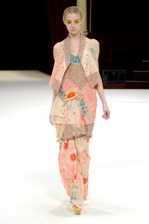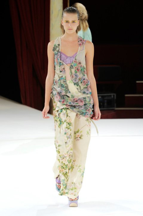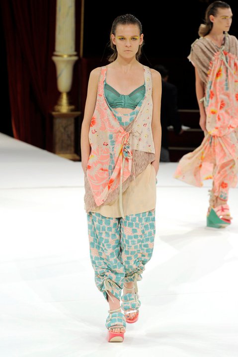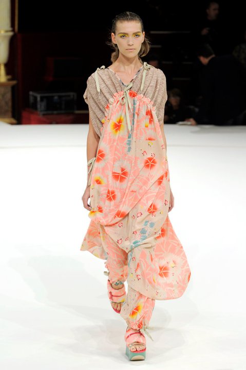 Imprimés fleuris japonisants, teintes pastel, socques de bois laqué, tout rappelle les origines de la Maison Kenzo. Combinaisons, pantalons à la coupe ample et robes tuniques dissimulent les courbes tandis que les décolletés souvent profonds laissent deviner une lingerie colorée et pétillante.