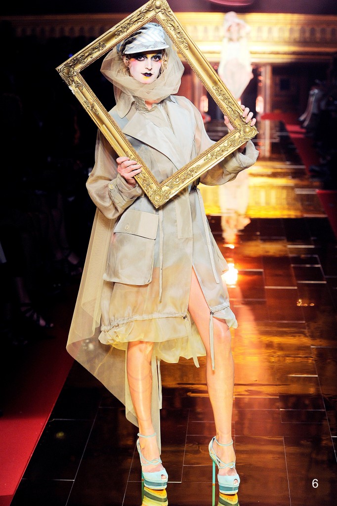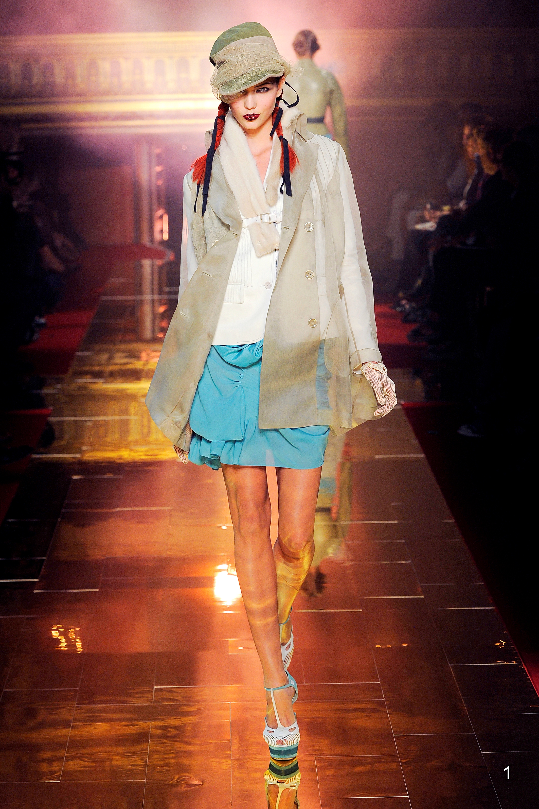 En cas de pluie printanière, John Galliano, fidèle à ses années londoniennes, imagine Maria Lani dans un trench léger gris transparent raccourci en organza, un foulard à pois servant subtilement de ceinture. Et si la journée est ensoleillée, c’est sous une ombrelle qu’elle abritera sa peau délicate.