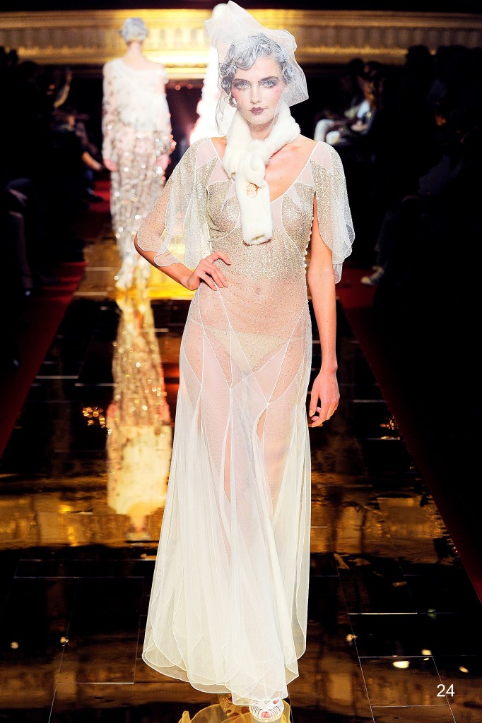 Pour les soirées chics, le designer imagine des robes blanches incrustées de cristaux, de broderies de perles argentées ou de métal doré, inspirées par les sculptures métalliques de Brancusi. Un robe en soie fine transparent terminée par des plumes d’autruche est une excellente alternative plus discrète.