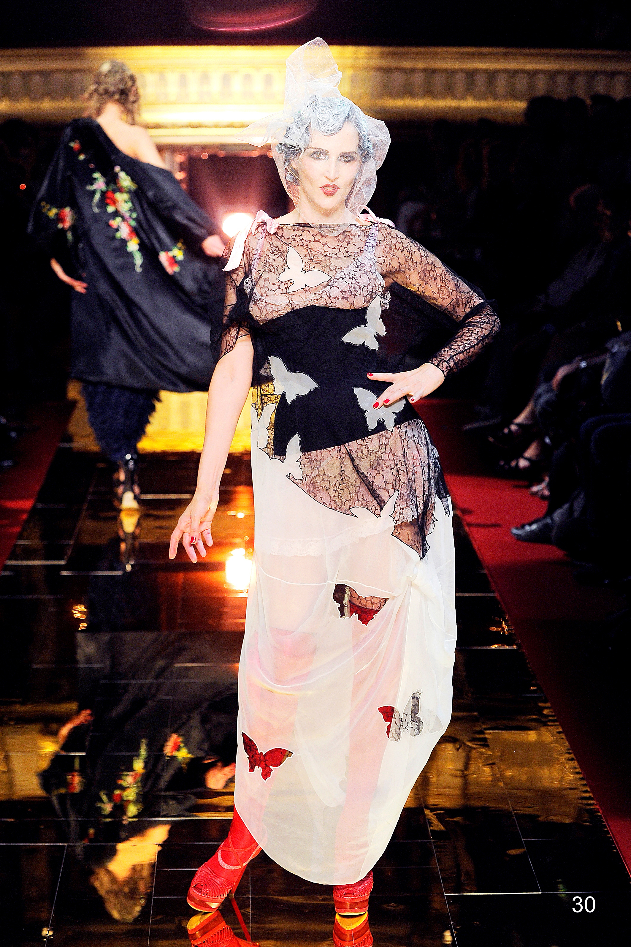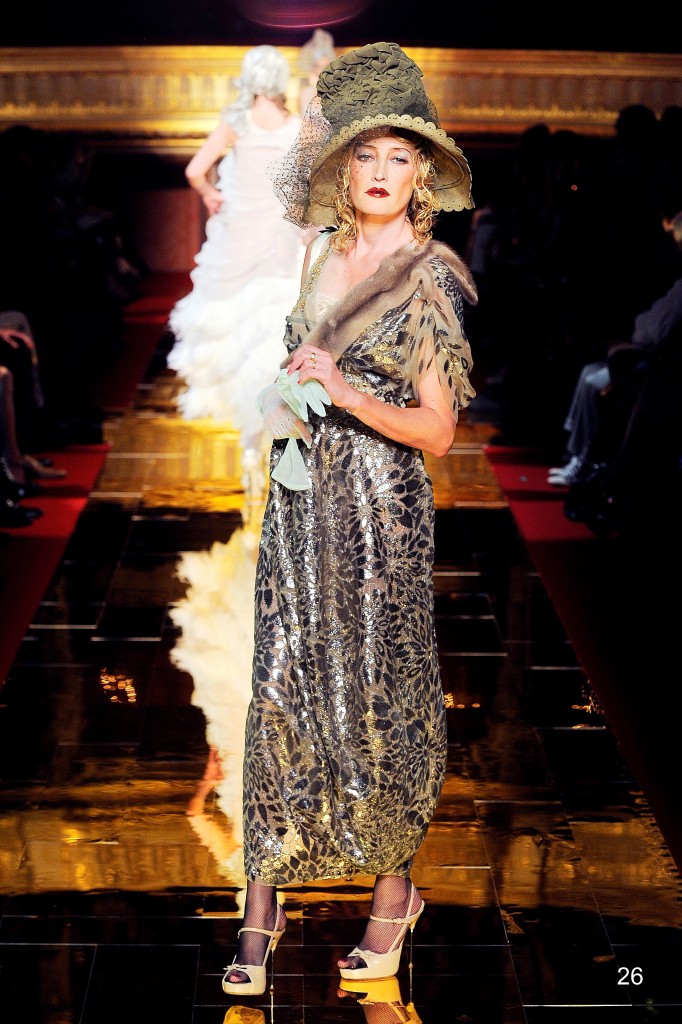 Et comme tout spectacle mérite un final d’exception, c’est sous une pluie de confettis dorés qu’apparaît la silhouette de John Galliano qui n’est pas sans rappeler celle du Kid de Chaplin. Après tout, le créateur n’est-il pas l’enfant terrible de la mode ?