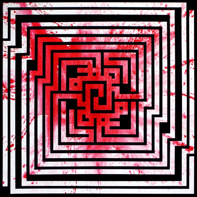 Magnant avec brio la bichromie blanc – noir, ces œuvres fascinent et hypnotisent. Le regard suit alors les courbes de ces écritures tracées à l’adhésif et parcourt le labyrinthe de l’esprit de l’artiste. Très vite, on oublie qu’il s’agit de lettres, de mots ; chaque spectateur en fait sa propre représentation et parfois interprétation. Et lorsqu’il y ajoute du rouge comme dans sa série Autopsy, c’est presque le sang de l’artiste qu’on a l’impression de voir, l’autopsie de son esprit.