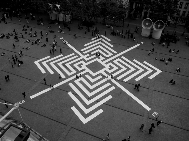 Certaines des œuvres apposées sur le bitume par L’ATLAS sont des boussoles, dont le centre figure une forme labyrinthique. Exécutées à même le sol comme celle sur le parvis du Centre Pompidou, elles semblent nous exhorter à ne pas perdre le nord et transforment la rue en énorme carte. Nous montrant la voie, elles nous questionnent également sur notre cheminement.