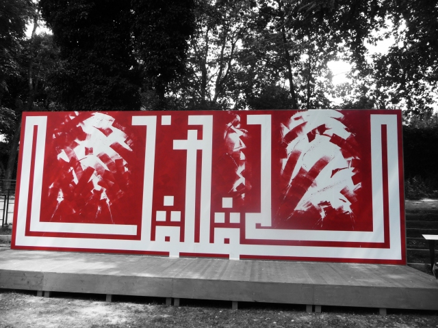 L’écriture du nom L’ATLAS devient alors une calligraphie sous forme de labyrinthe, à la fois symbole d’une ville carnivore où on se perd et d’une passerelle entre Orient et Occident, faisant ainsi furieusement écho aux labyrinthes d’antan, ceux présents dans les nefs de cathédrales. Mais au lieu de nous indiquer une ligne directive et précise, l’artiste préfère nous perdre dans ses débranchements et ses méandres pour nous amener ainsi à réfléchir sur nous-mêmes peut-être, comme un canal long menant à l’introspection.