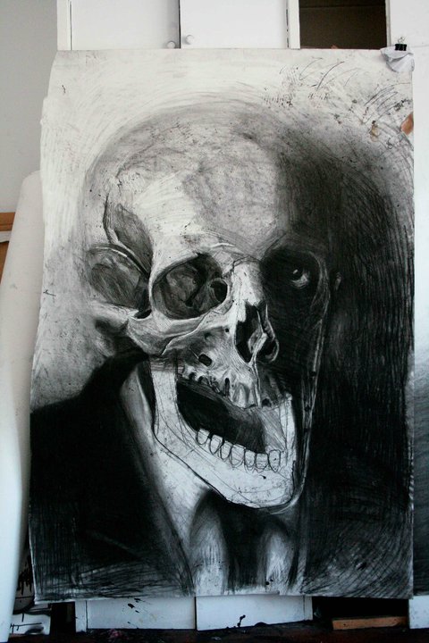 L’œuvre la plus bouleversante et la plus magique est à mon avis l’installation imaginée par Jérôme Zonder. Au détour d’une porte débute le couloir de circulation de l’Espace Culturel, espace étroit et clos permettant de passer d’une partie à une autre. S’étirant sur plusieurs mètres, l’installation The father’s and mother’s wood apparaît alors tout autour de nous, nous happant et nous emmenant dans un univers étrange et fascinant. Une fresque totale en noir et blanc, recouvrant l’ensemble des murs, sols et plafonds nous enveloppe mais c’est pratiquement une vision de charnier, de corps enchevêtrés partiellement dénudés, de crânes et d’images infernales, un cauchemar graphique qui nous conduit aux portraits du père Papa et de la mère Maman de Peter Pan. Cette fresque, puissante vanité, ne se laisse pas uniquement voir, elle devient presque vivante, on la parcourt, on essaye de la contourner, de la traverser mais on finit par piétiner ces corps emmêlés au sol car il n’existe aucune possibilité d’y échapper.