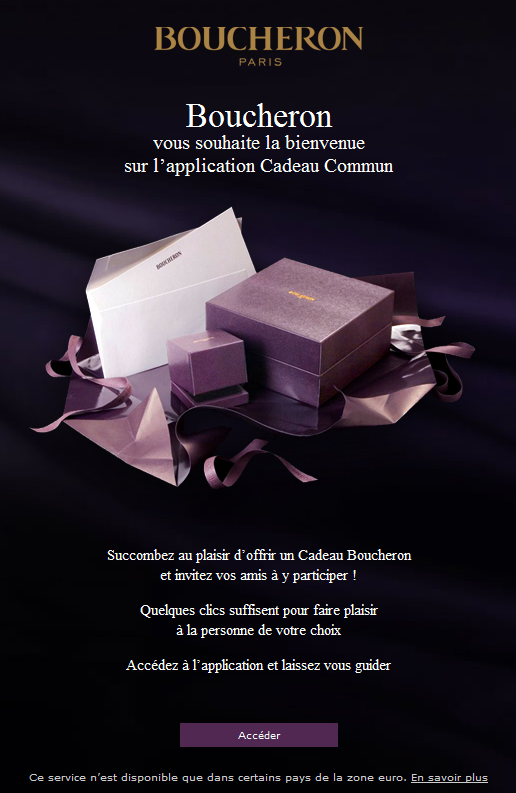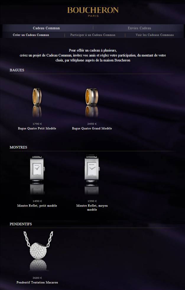 Vous trouverez l’application « Cadeau Commun » (http://apps.facebook.com/cadeau-commun/) sur la Fan Page Boucheron (http://www.facebook.com/boucheron).