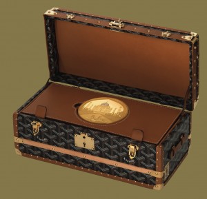 L’ensemble de cet objet précieux est présenté dans une reproduction unique de la Maison Goyard, malletier depuis 1853, fournisseur reconnu et recherché des plus grands et notamment des Maharajas à l’époque de leur splendeur.