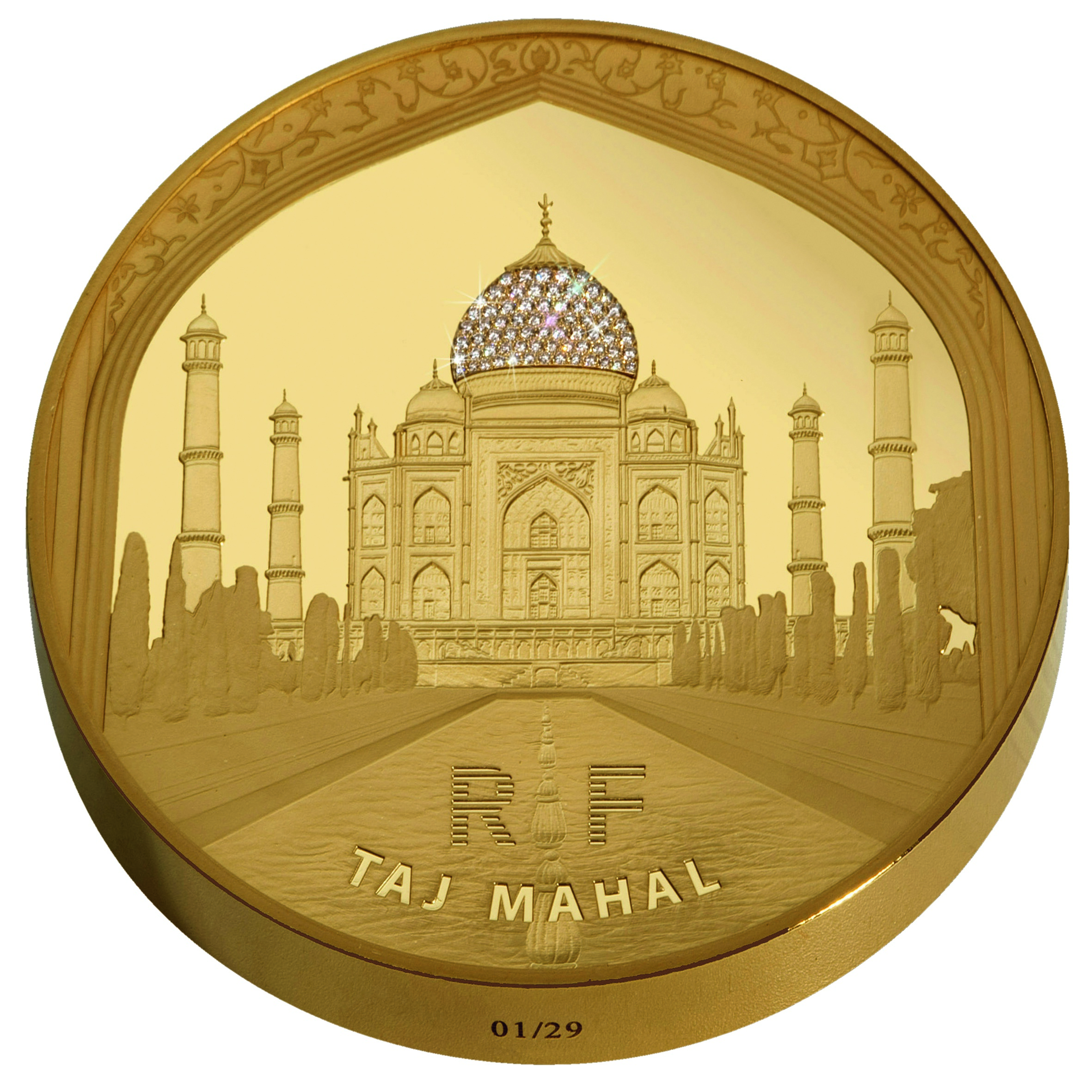Des caractéristiques uniques Cette pièce d’un kilo est en or 999‰. Elle présente un diamètre de 85 millimètres. Sa face présente une perspective du Taj Mahal, avec son long bassin arboré et la mention RF en traitement spécifique à la manière d’un reflet. La valeur faciale est de 5 000 euros. Le revers reprend le dessin du bâtiment de l’UNESCO, ainsi que son logo et le millésime 2010. 68 diamants, de +/- 0,52 carats au total, recouvrent le dôme du Taj Mahal. Cette spectaculaire pièce Taj Mahal, en qualité belle épreuve, est réalisée en 29 exemplaires uniquement. Elle est présentée dans une reproduction unique de la Maison Goyard, malletier depuis 1853.