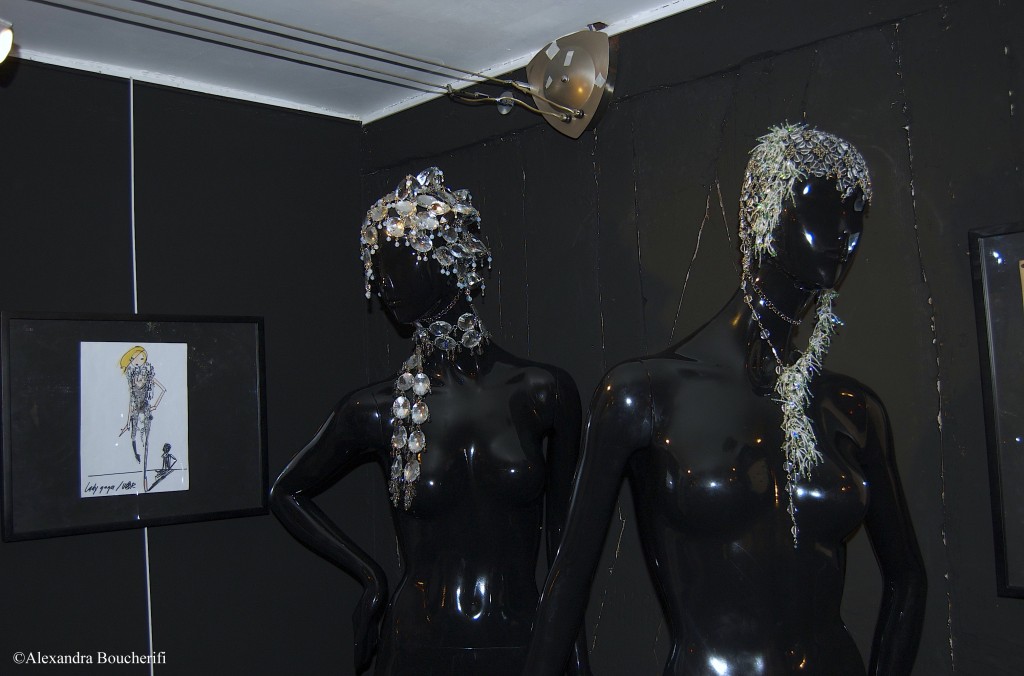 Une sélection de dessins originaux de tenues et de pièces exceptionnelles portées par Lady Gaga lors de ses shows ou clips nous sont proposés au premier étage de la galerie. Du body en cuir créé par Jean-Claude Jitrois pour son premier concert en France aux dessins de Viktor and Rolf, en passant par les ballerines de Junko Shimada ou encore le chapeau Thierry Mugler et les fameuses bottes grises Christian Louboutin portés dans le clip Telephone, bon nombre de pièces fabuleuses peuvent être admirées dans la partie « Habits de scène de Lady Gaga » ; auquel on accède après avoir dépassé une scène de crime directement inspirée par le clip de la chanson Telephone.