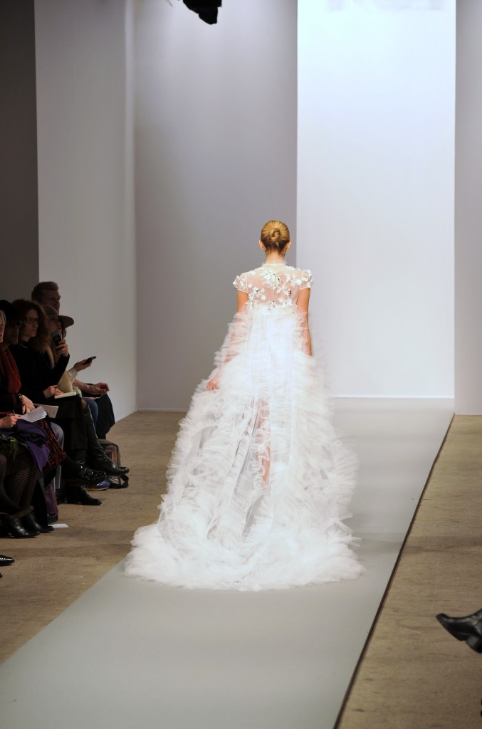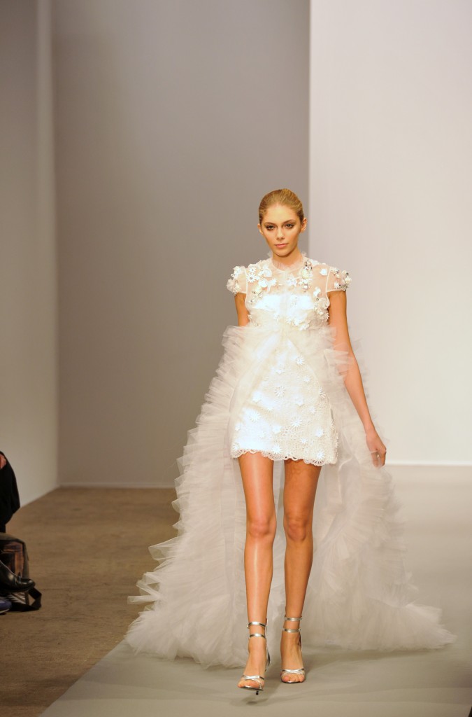 Le court, assez présent, est joliment envisagé pour les grands soirs et atteint son apogée dans la mini robe de mariée dont la traîne très aérienne semble porter la femme en une véritable démonstration d’élégance et de grâce.