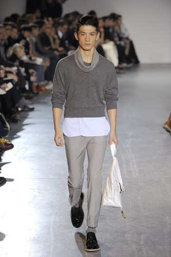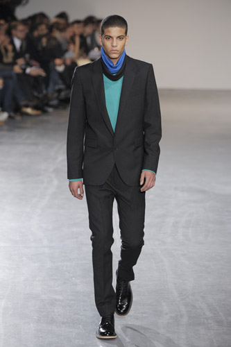 La couleur maitresse est le gris, et c’est autour d’elle qu’il compose ses tenues. Parfois on voit des touches de couleurs vives, qui donnent un effet de puissance et d’audace, c’est le charme de la jeunesse.