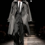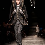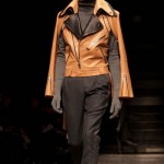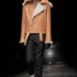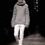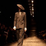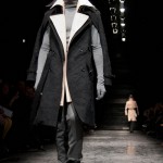 Manteaux et vestes sortent de leur rôle d’habit qu’on laisse de côté dans une tenue. Parties intégrantes des tenues proposées par JuunJ pour l’hiver prochain, ce sont manteaux amples et vestes d’aviateurs qui servent de révélateurs, via des ouvertures savamment placées. La construction des hauts est contrebalancée par des pantalons larges, presque laches, et des chaussures qui semblent extrudées de plaques en plastique.