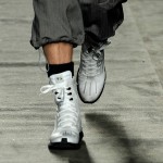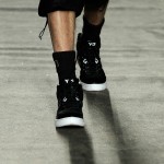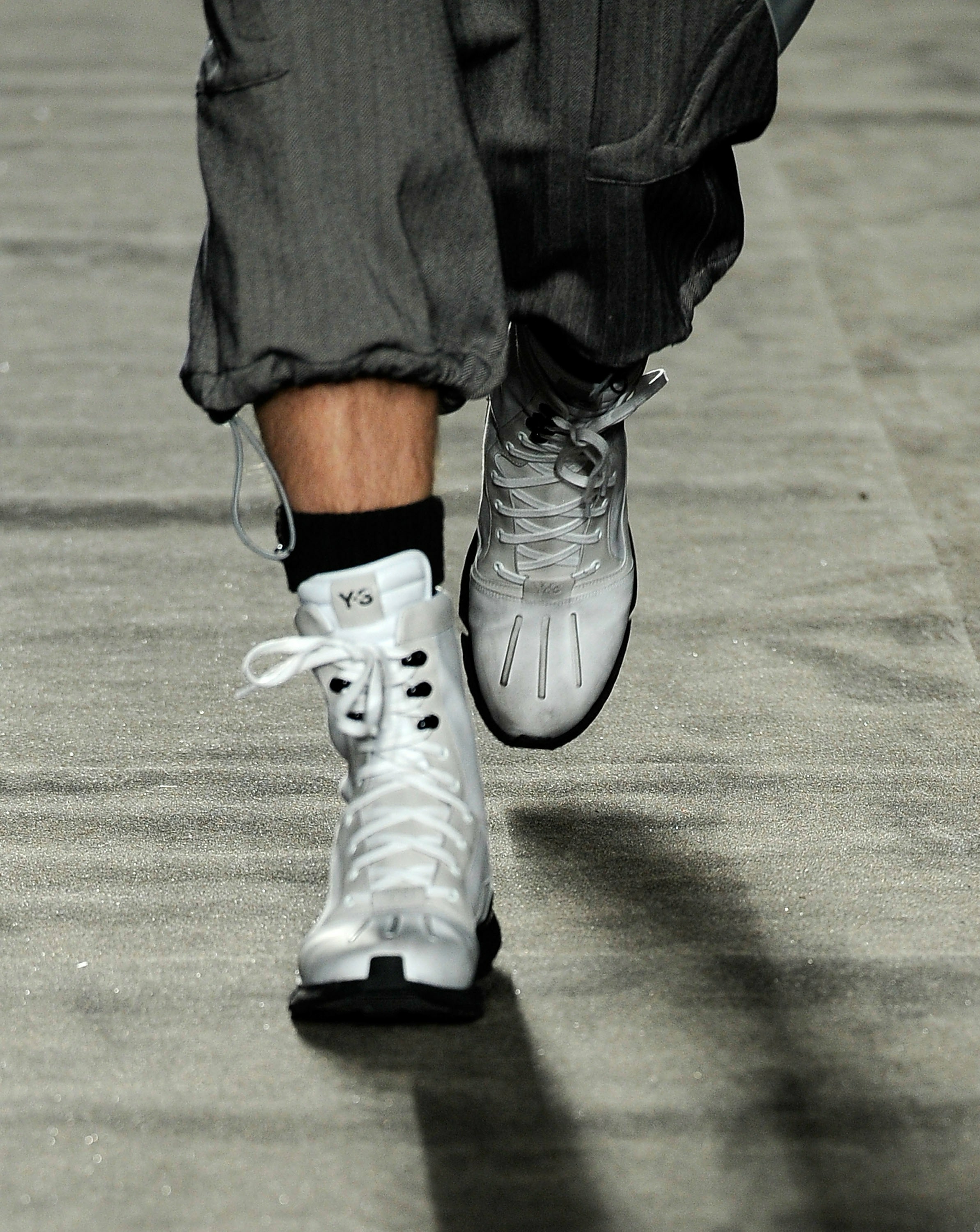 Au niveau des accessoires, Y-3 souligne les thèmes de la chaleur et du confort, avec des foulards à capuche, chapeaux en nylon matelassés, ceintures et des gants avec trois morceaux de cuir, un jeu subtil sur la tradition des trois bandes. Les chaussures pour homme et femme combinent l’expertise technique d’adidas avec des formes et matériaux classiques, tel la botte du guerrier japonais avec une découpe précise pour homme et une plateforme « origami » pour femme.