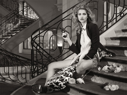 La femme Balenciaga est armée, conquérante et maîtresse de son destin. Elle représente la quintessence de la féminité assise sur les marches couvertes de roses, faite de douceur et de force. Serait-ce un clin d’œil à Rose, c’est Paris ? Le sac Edition en PVC et cuir broderie Damier, à la fois en vitrine et sur ces fameuses marches, semble être constitué de multiples pièces du puzzle de notre intrigue policière. La femme Ann Demeulemeester est conquérante, presque guerrière avec une pointe de défi dans le regard. Elle vient de découvrir sa « mission » et tient encore les cartes du jeu.