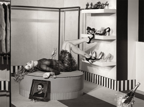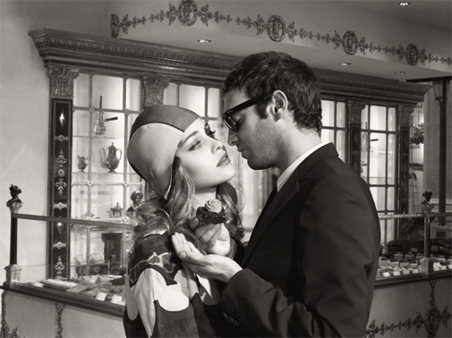 La femme Marni, faussement fragile, s’abandonne aux douceurs au Café Pouchkine dans les bras de cet homme mystérieux tandis que la femme Valentino, impertinente, rit aux éclats et boit du champagne presqu’offerte sur ce canapé rond entourée chaussures dans une tenue d’une rare délicatesse. L’homme est lointain et son souvenir dans un tableau. Mais qui est cet homme ?