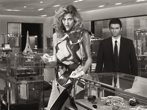 « Dans l’esprit du travail que nous avons présenté l’an dernier à la BNF, sous le titre Rose, C’est Paris, nous avons imaginé une fiction policière dont le cadre serait le Printemps et l’enjeu, une Tour Eiffel recouverte de diamants. Notre héroïne (Ana Beatriz Barros) se glisse sur les toits du magasin à la tombée du jour: elle semble descendre du ciel. La voici dans les lieux, parcourant les rayons déserts. Elle se change, elle n’a qu’à se servir, les plus belles robes sont à sa disposition. Un jeu de cartes lui révèle but de sa mission: dérober une précieuse Tour Eiffel. Mais voilà que surgit un homme armé, en costume noir. Est-ce son complice ? Ne va-t-il pas la trahir ? Et si, au bout du compte, c’était l’amour que notre héroïne allait découvrir au Printemps…? » explique Bettina Rheims.