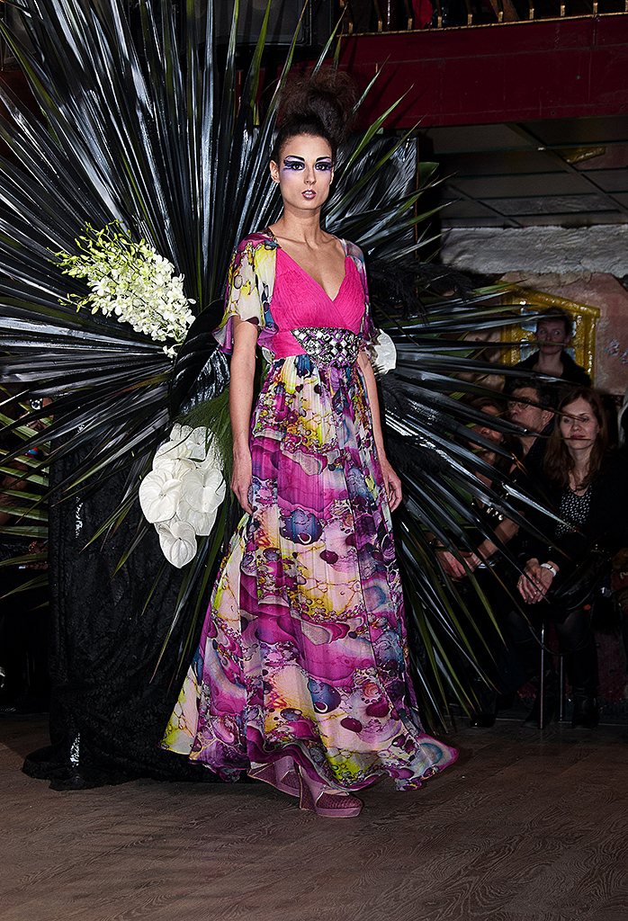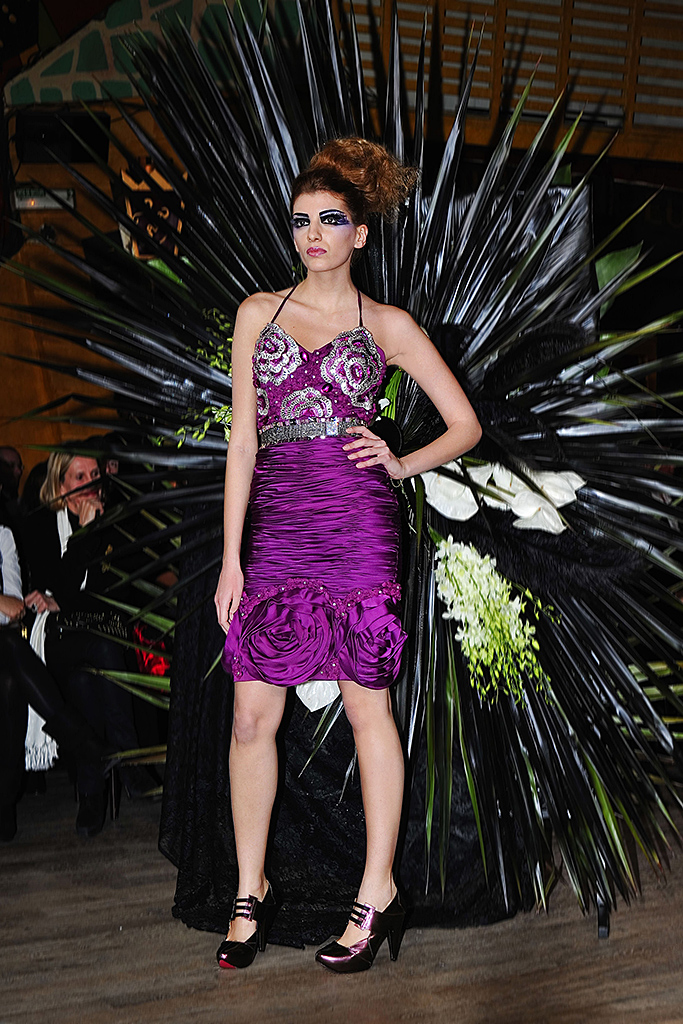 Une pointe de fuchsia shocking et de rouge lipstick animent une palette combinant le prune, le taupe et le gris perle avec une prédominance du noir traité dans plusieurs aspects : du tulle transparent rebrodé de pierreries et de plumes d’autruches à la maille angora ombrée.