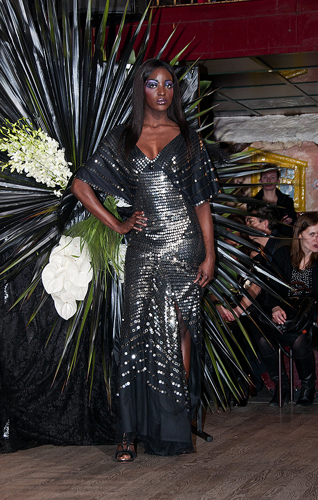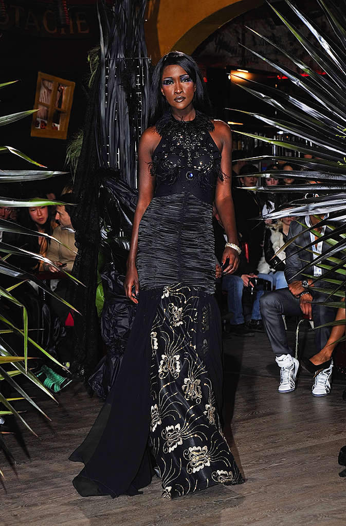 En quête d’absolu, le créateur puise son inspiration dans l’univers drastique de la danse : la rigueur et la justesse qui caractérisent la discipline se retrouvent dans l’extrême raffinement des robes toute de dentelle noire : la même folie de la persévérance aboutit à un résultat minutieux sur des pièces entièrement rebrodées de rubans de satin ou de lignes de paillettes soulignant de manière sculpturale les détails de l’anatomie féminine.