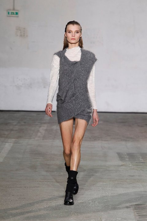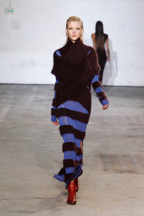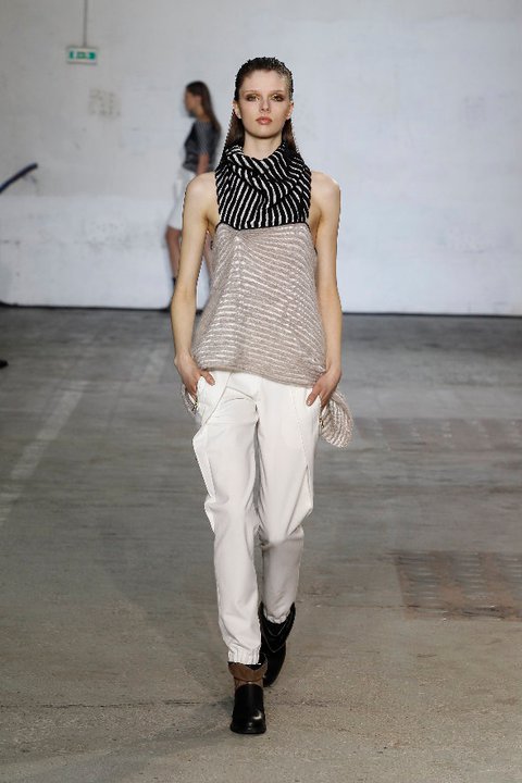 Pour le créateur portugais, point de marinière même si la rayure a la part belle dans ce vestiaire très sobre, mais plutôt un travail autour de la maille et des lainages pour une ambiance cocooning de rigueur. Les effets de drapé et de découpes apportent élégance et originalité aux robes et tuniques classiques. On retiendra l’entremêlement de mailles sur plusieurs pièces rappelant le nœud marin.