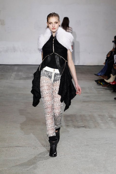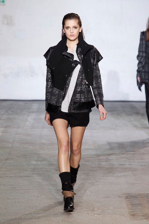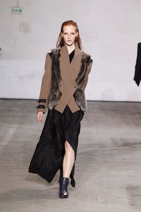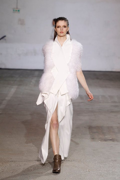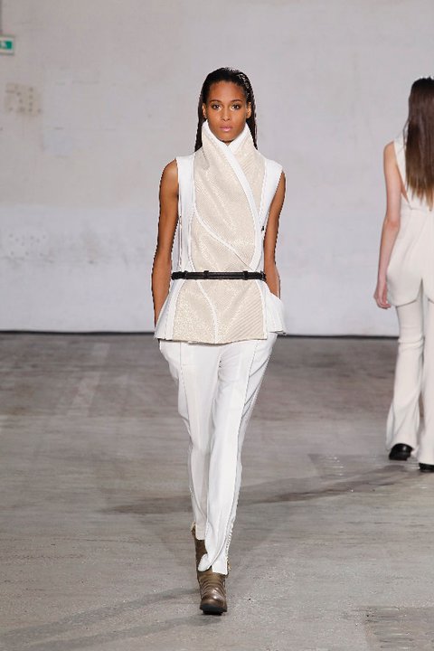 L’asymétrie est de mise et est propice aux mélanges de matières très prisés du créateur. De grosses fermetures éclair viennent ajouter à l’impression de « compartiments » laissée par certaines pièces. Les effets de vagues sur certaines vestes à fermeture éclair dynamisent la démarche d’une femme résolument active contre vents et marées.