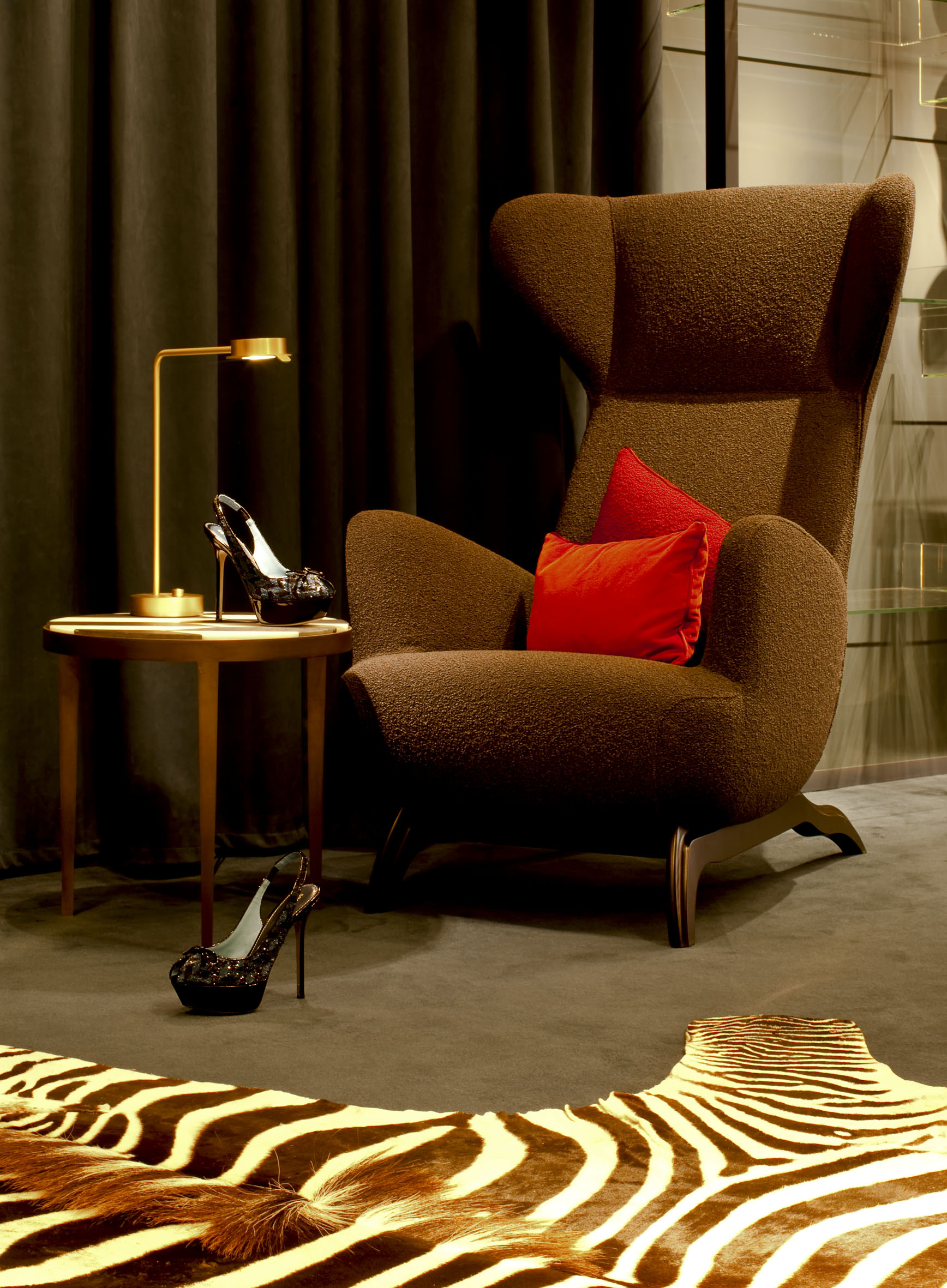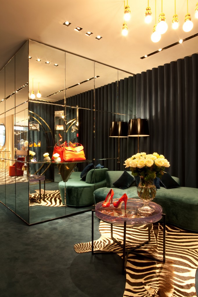 La « Scène » offre une ambiance lumineuse à souhait avec son immense miroir circulaire reflétant l’éclairage des nombreux spots et sa chaise longue de velours rouge. Les parois recouvertes de rideaux aux teintes chair et le sol en marbre italien orné de chevrons blancs et noirs en font l’écrin idéal pour admirer et essayer escarpins et bottes de la griffe présentées sur des supports invisibles.