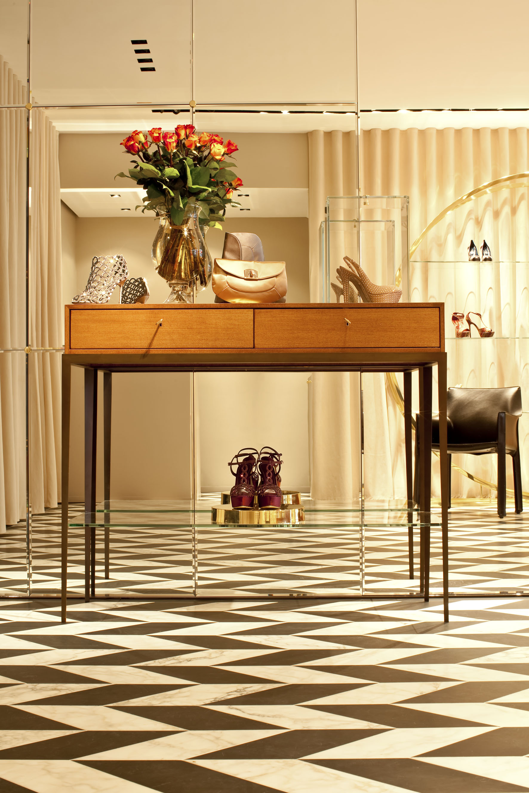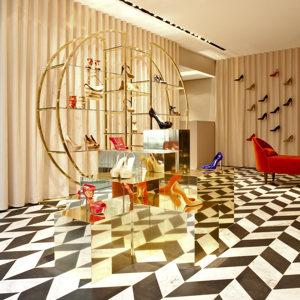 En collaboration avec le directeur de la création de la maison, Francesco Russo, la société de design londonien Studioilse a transformé l’antique boutique inaugurée en 1999 en véritable scène de théâtre permettant ainsi au passant de se transformer en spectateur lors du rituel oh combien aimé de l’essayage des souliers.