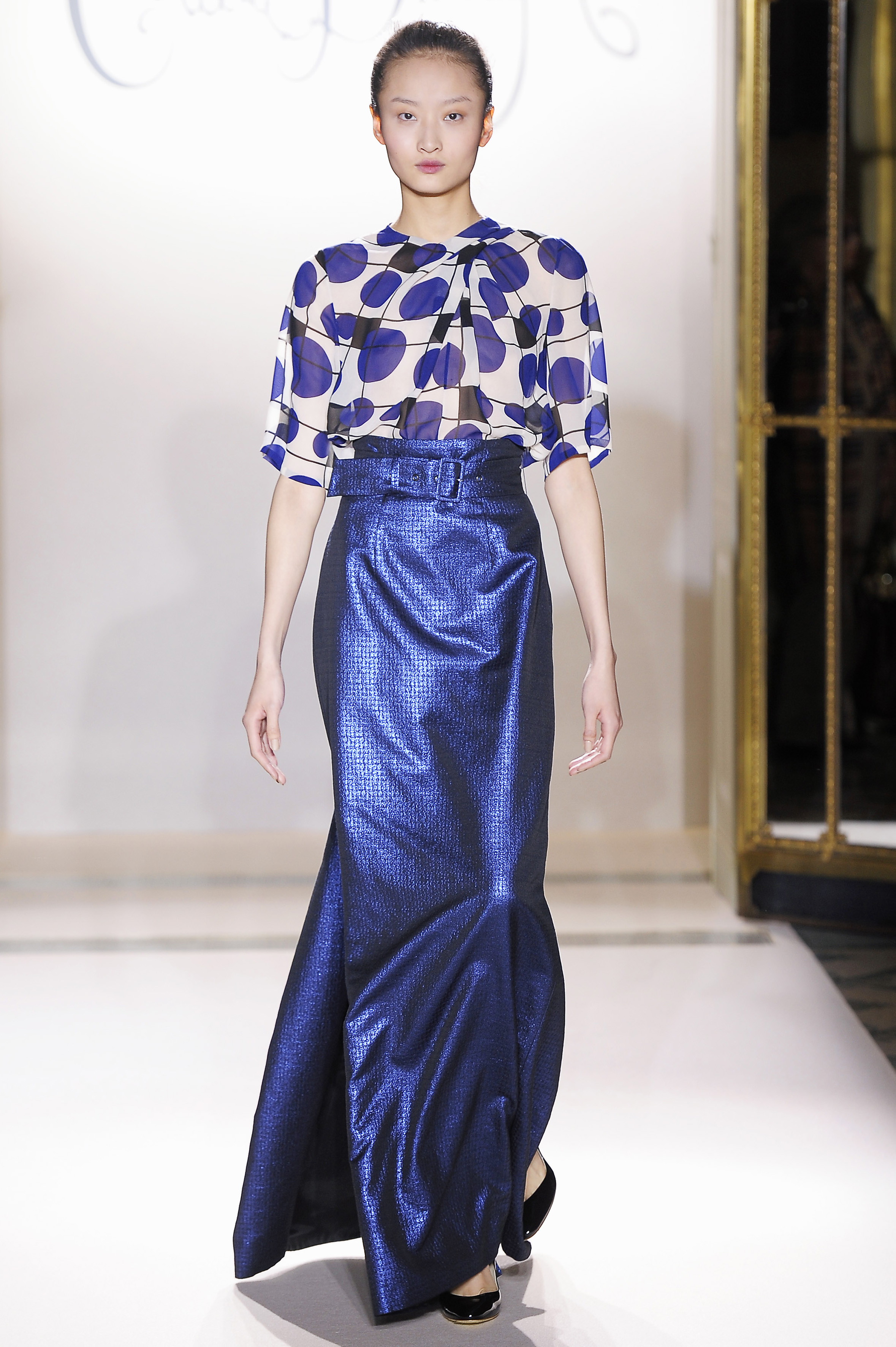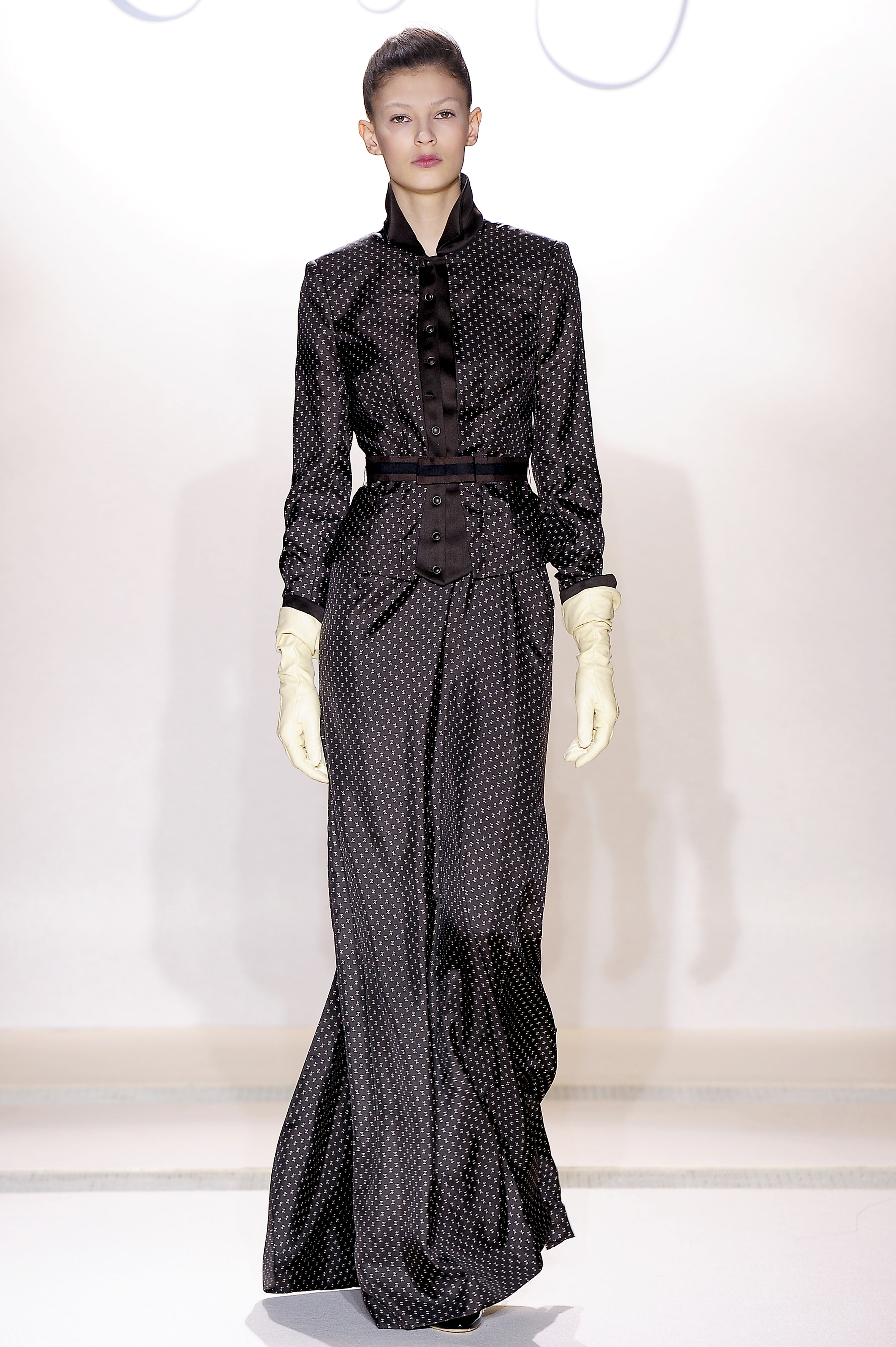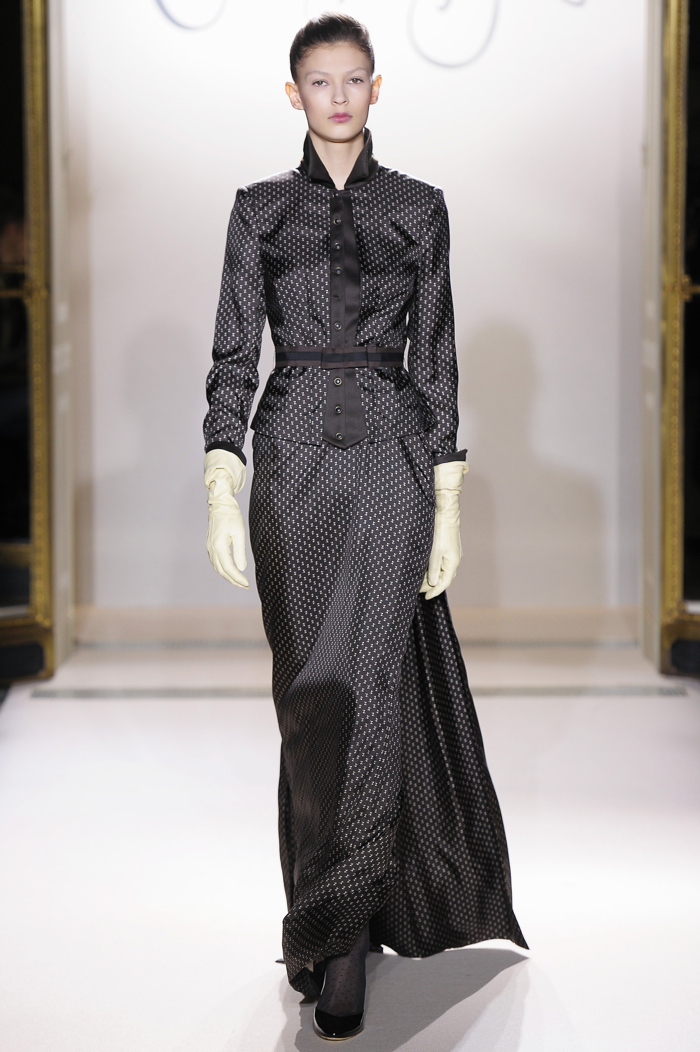 Structured shapes and sumptuous tailoring hark to the athletic luxe of true Argentinean equestrian, tradition re-imagined in the chimerical fabrications of leaden lace jodhpurs and metallic jacquard bustle back skirts.