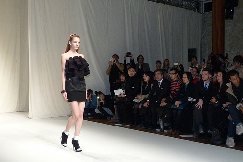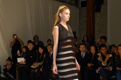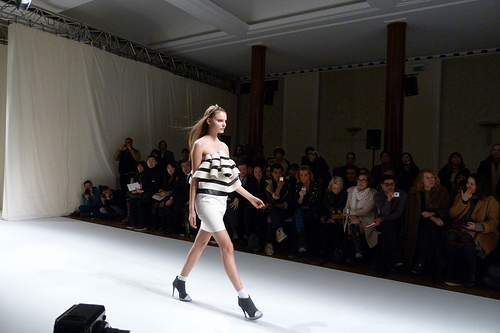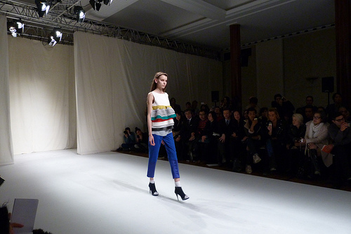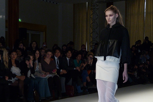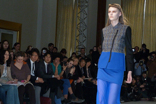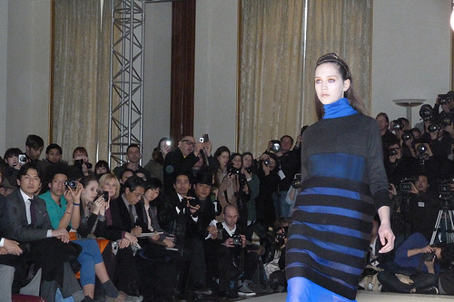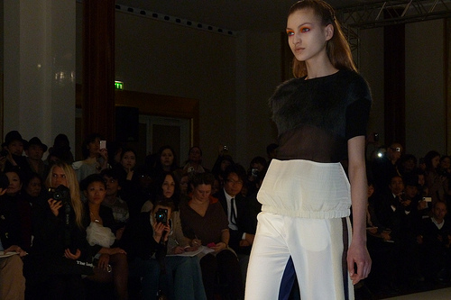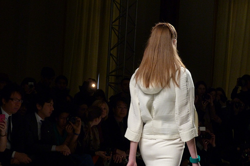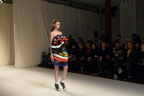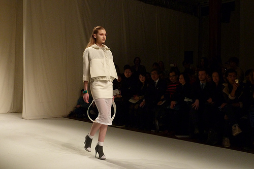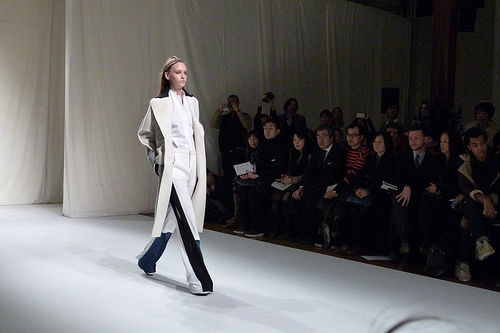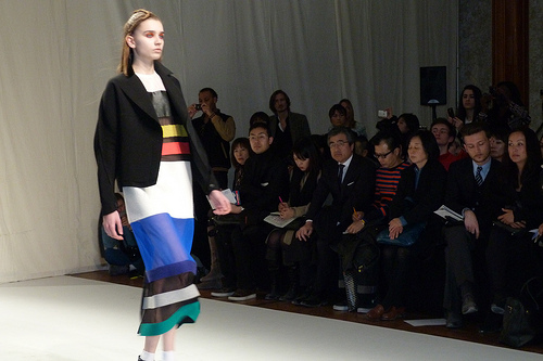 Set to music by Koji Miyakawa, the Commuun show started out with a “white is white” (production) virginal palette and moved progressively towards an almost rainbow status, with a concentration on volumes and shapes displayed by ample ruffling mostly around the bust. The collection also goes from an almost sports-wear style to a fluffy-girlie style, yet retains a seriousness with it’s bold colors and geometric lines. Mixed texture pieces seem to be a common theme for next Fall from more than one designer, as we see in the fabric striping here as well with sheer and fur.