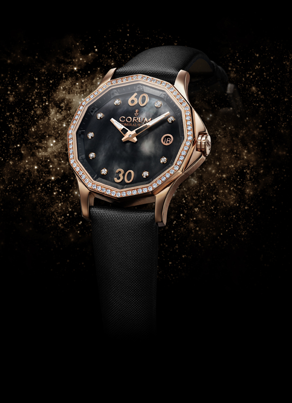 Honneur aux dames, l’Admiral’s Cup Legend 38 est dotée d’un mouvement mécanique à remontage automatique, le calibre CO082, pourvu d’une masse oscillante décorée du logo Corum. Battant à 28’800 alternances par heure, il dispose d’une réserve de marche de 42 heures et propose les fonctions heures, minutes et date à 3h. De quoi laisser s’exprimer de subtils cadrans chatoyants et raffinés. Réalisés en nacre provenant de la Pinctada Maxima – une huître perlière dont l’habitat naturel est l’océan Pacifique – les cadrans noirs ou gris de ces déclinaisons féminines sont décorés de neuf index sertis d’un diamant, rhodiés ou dorés selon le matériau du boîtier, et des chiffres 30 et 60 disposés en applique à 6h et à 12h. Proposée en acier ou en or rouge 18 karats, dans les deux cas dotée d’une lunette sertie de 72 diamants pleine taille pour 0.58 carats, l’Admiral’s Cup Legend 38 est rehaussée d’un bracelet en satin doté d’une boucle déployante avec poussoirs de sécurité.