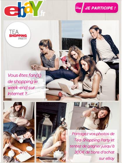Devant l’accroissement du phénomène, et séduit par ce concept, eBay.fr a lancé en début de semaine le concours « Tea-Shopping Party » sur Facebook. Il s’agit d’un concours photo ouvert a tous les utilisateurs de Facebook et accessible depuis la page eBay France, afin de les faire partager leur expérience shopping à la maison en images et tenter de gagner jusqu’à 300€ de shopping sur eBay.fr.