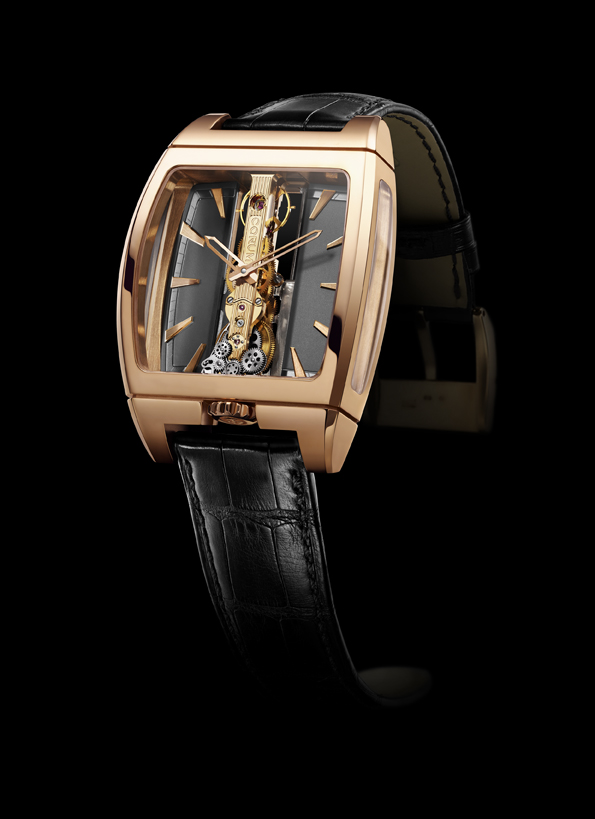 précision dans la durée – et d’un barillet miniaturisé pour ne pas rompre la verticalité de l’ensemble. Platine et ponts sont en or 18 carats (assorti à l’or de chacun des boîtiers), avec un nouveau décor guilloché vertical pour accompagner le mouvement linéaire de la masse et pour souligner plus encore la puissance de ce mouvement en ligne.