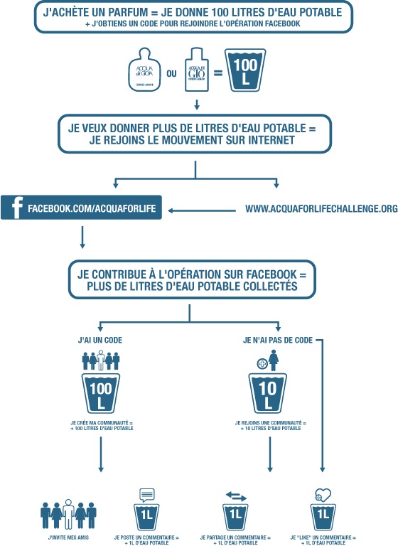 Depuis le 1er mars 2011, chaque flacon vendu génère un don de 100 litres d’eau potable par an aux enfants et à leur communauté. Les participants sont ensuite invités, grâce à un code personnel indiqué sur l’étui du parfum choisi, à prolonger leur action sur Facebook via l’application Acqua For Life Challenge : http://www.facebook.com/acquaforlife