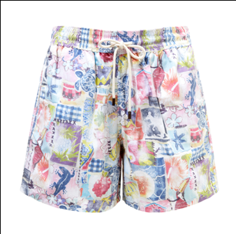 À l’occasion de son quarantième anniversaire, Vilebrequin réalise un tissu patchwork, reflet de la richesse de ses imprimés et des thèmes qui lui sont chers. Dans des tons pastels, les salamandres côtoient les pélicans et les kangourous ; les fruits se juxtaposent aux eurs, le tout signé de la tortue, symbole de la marque, et du logo original des années 70.