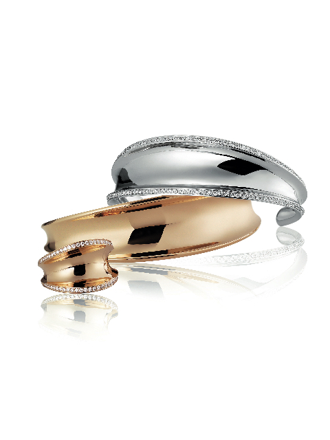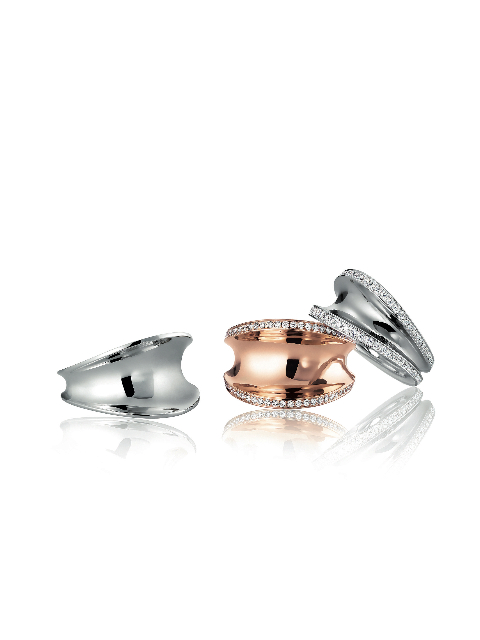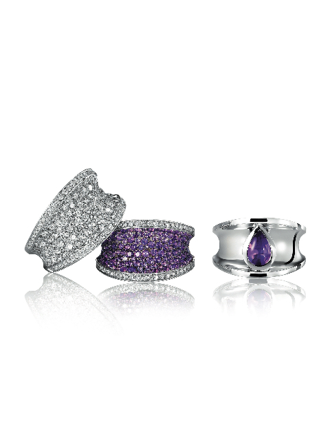 Glisser délicatement un bracelet à son poignet comme on enfilerait un long gant de satin. Relever ses cheveux en chignon afin de fermer un pendentif. Pencher la tête de côté et accrocher une boucle d’oreille, puis l’autre. Se parfumer. Se poudrer. Choisir une bague ou deux. Celle-ci ? Plutôt celle-là. Vérifier l’heure. Vite, le chemisier en soie, le rouge à lèvres, un peu de fard sur les joues… Lorsqu’elle s’apprête, la femme Imperiale se presse tout en restant parfaitement maîtresse d’elle-même. Sensuelle et sûre d’elle, elle va à l’essentiel, choisissant pour la mettre en valeur des matières nobles et pures, des pièces à la qualité irréprochable. Discrets mais présents, sobres et pleins d’allure, les bijoux qu’elle porte conjuguent douceur des courbes et fermeté des matériaux. Ils révèlent sa beauté tout en levant le voile sur son caractère affirmé. Ici, l’association de l’or, blanc ou rose, et des diamants, s’impose avec force dans la lumière, sans toutefois aveugler. La pureté du métal et des pierres apparaît dans tout son éclat. Les bagues, comme les bracelets ou les boucles d’oreilles, en or tout simplement, ou partiellement ou totalement sertis de diamants ou d’améthystes, rappellent par leur galbe les couronnes de l’ère impériale mais aussi l’harmonieuse cambrure d’un corps féminin, dans laquelle vient parfois se lover un cabochon améthyste. Tout en délicatesse et puissance, ces bijoux jouissent d’une distinction extrême. Résolument contemporains, ils se portent sans contrainte, sans occasion particulière, en toute complicité avec la femme qu’ils illuminent.
