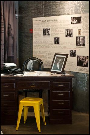 Les murs blancs, mélange de peinture et de carreaux de métro, accueillent les photos de l’exposition en cours « The Beat Generation : de Kerouac… à… James Dean ». L’ambiance épurée, quasi= clinique, est simultanément contrebalancée par des matières chaleureuses, étoffes, bois, ainsi qu’un mélange de mobilier design / récup’.