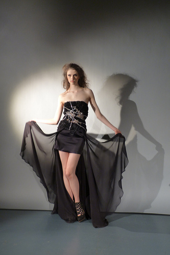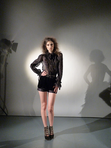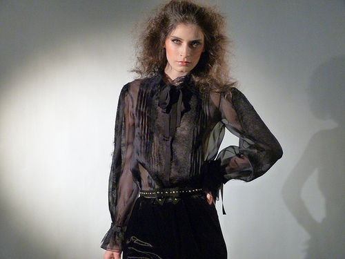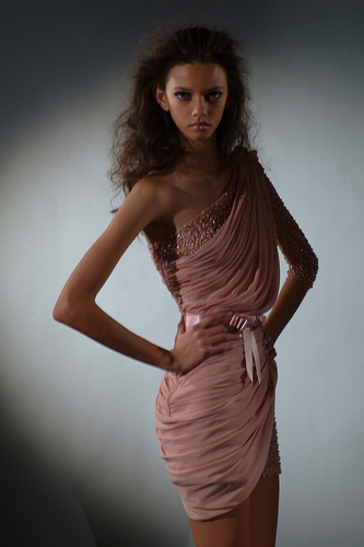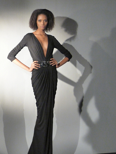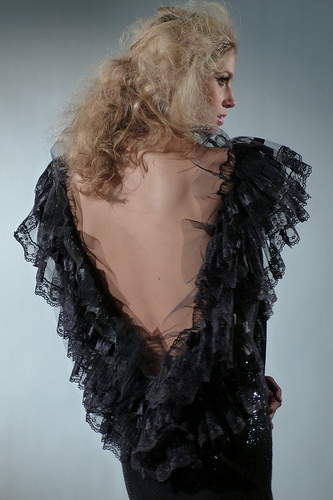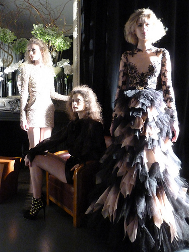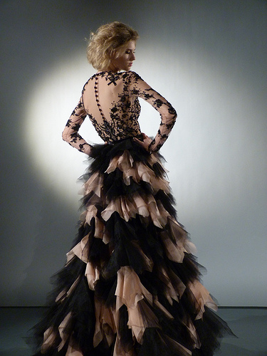 The collection : ballet pinks and blacks with lace and chiffon and light airy creations, glamorous and stunning, with attention to the textures of fabrics, how the light plays on them, as well as deep plunging neck-lines and back-lines, long gowns and mini dresses that reveal almost the entire leg, lace that suggests not-so-discreetly the skin beneath… all with a silhouette that brings us back to what real stars used to look like, the Marylins, the Elizabeths, the Grace Kellys who had bodies worth dressing up. Enough with the waify baggy look, and more of this real lady look!