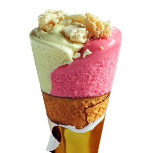 · D’une combinaison de glace vanille et de sorbet fraise, agrémentée de morceaux de meringue coco.